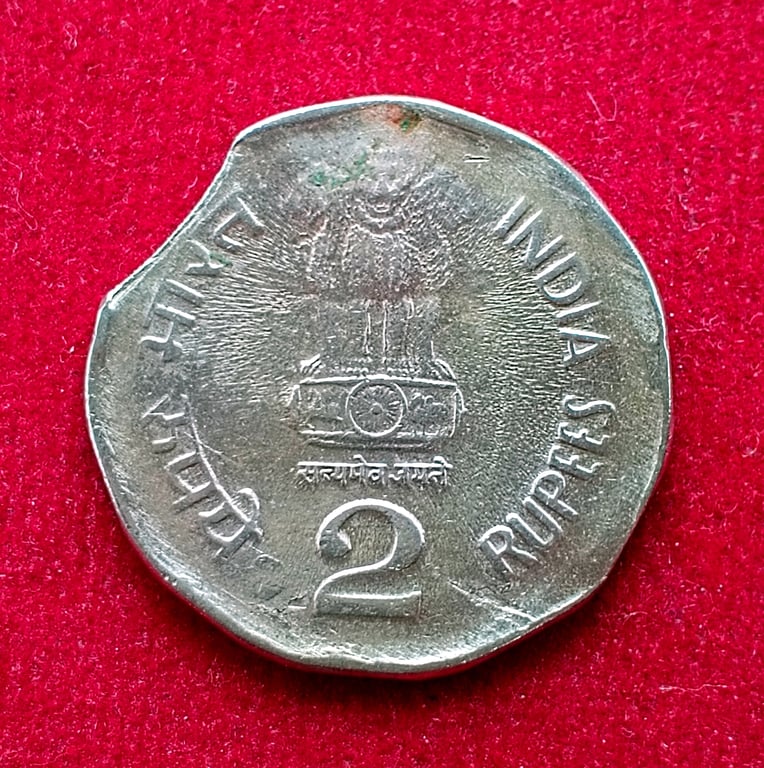 2 Rupees 2002 National Integration Curved Clip Error Coin (Hyderabad Mint)