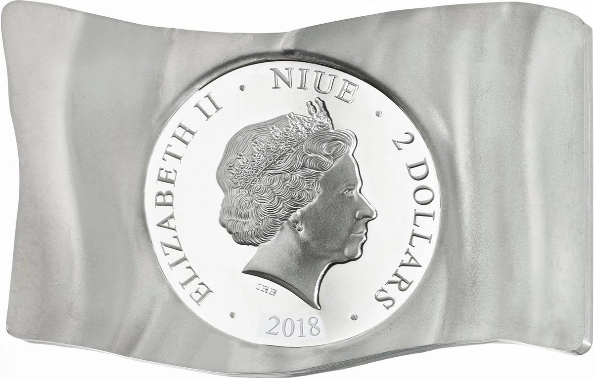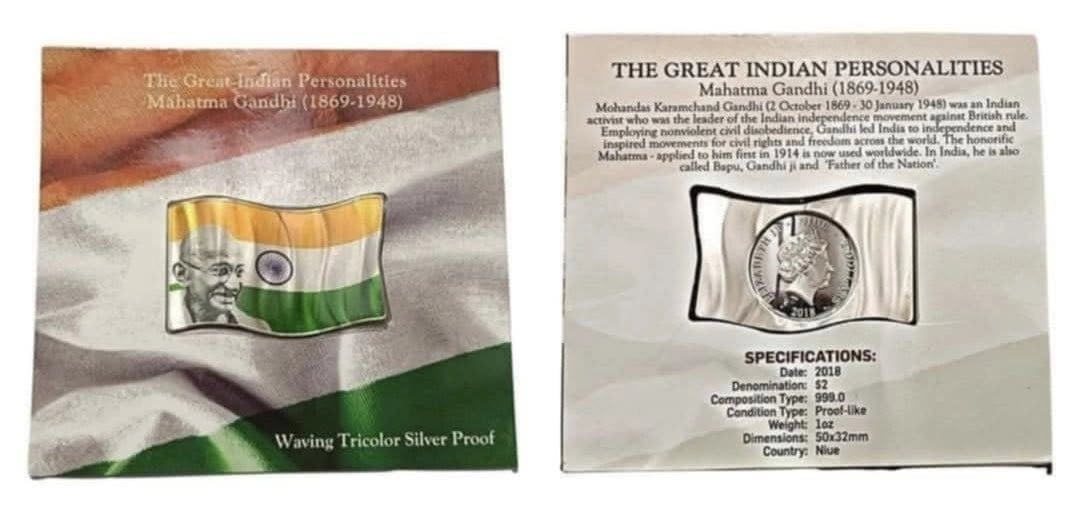 This distinctive 1 oz silver coin pays tribute to Mahatma Gandhi, featuring a colored depiction of him against the Indian tricolor flag. Struck in .999 fine silver with a proof finish, the coin boasts a unique rectangular shape measuring 50 × 32 mm. The obverse presents the effigy of Queen Elizabeth II, along with the inscriptions: “ELIZABETH II,” “NIUE,” “2 DOLLARS,” and the year “2018.” With a limited mintage of just 205 pieces, this coin is a rare collector’s item.