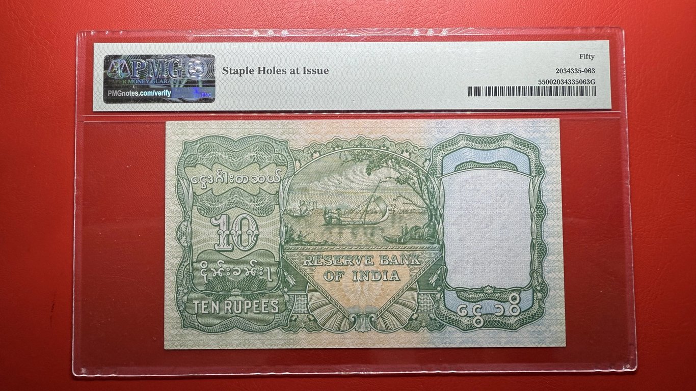 10 Rs British India Green Burma Issue Pmg 50 Grade Note