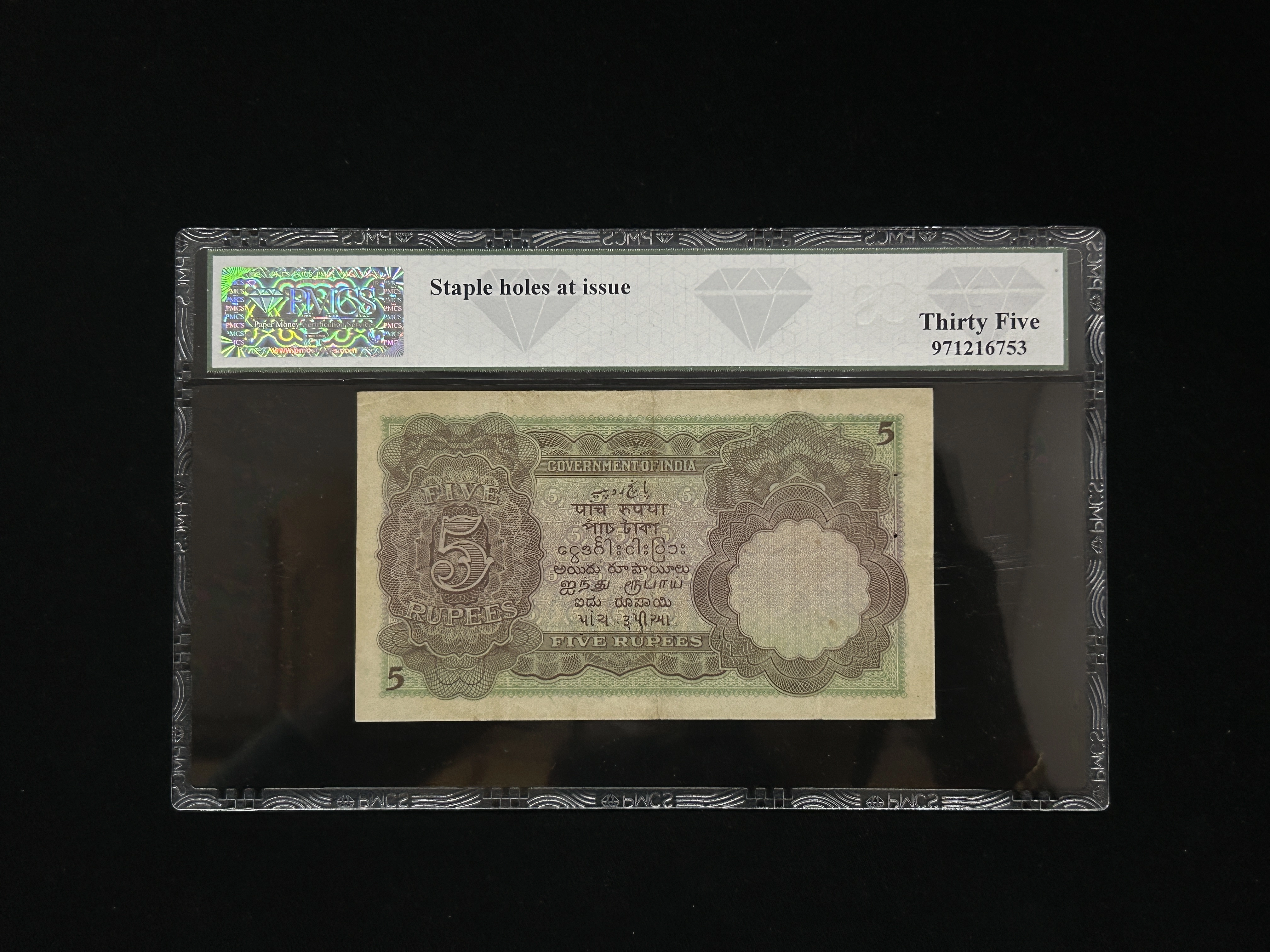 British India, 1934 Rupees 5 Banknote, King George V (KG V), Prefix (R78), Sign. J.W. Kelly, PMCS Graded 35, Rare