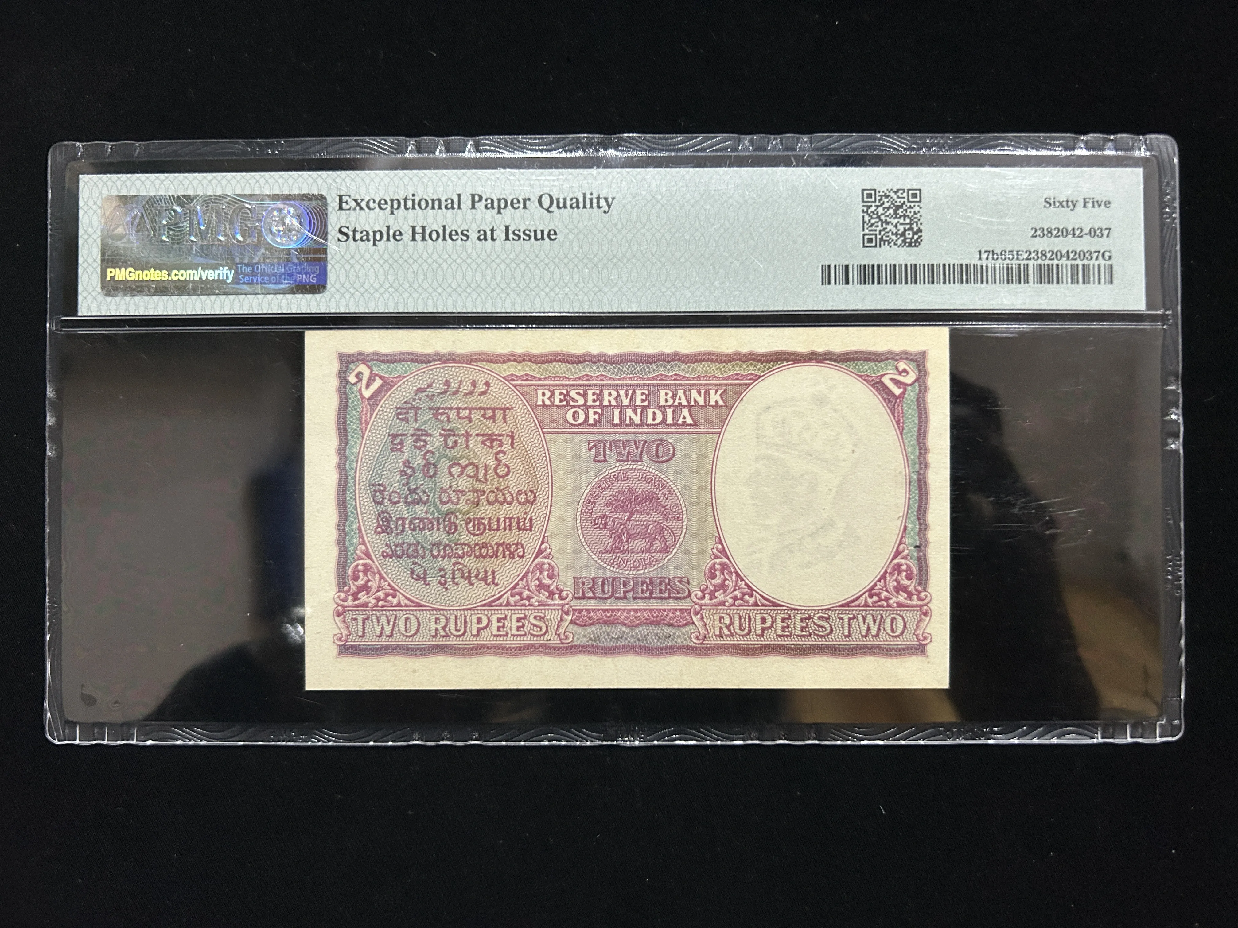 British India, 1943 Rupees 2 Banknote, King George VI (KG VI), Prefix (B78), Sign. C.D. Deshmukh, PMG Graded 65 (Top Grade), (B78 203077)