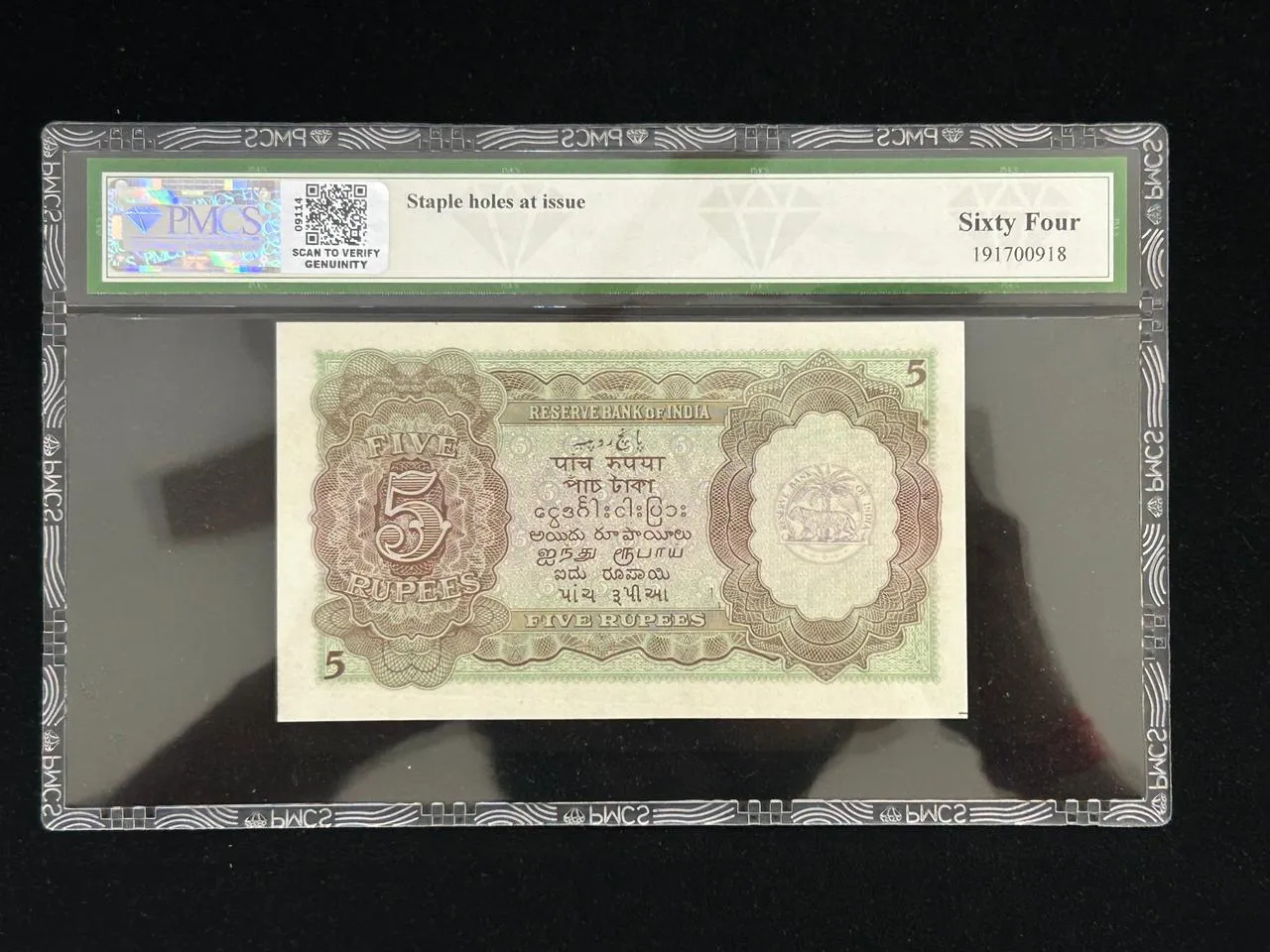 British India, 1944 Rupees 5 Banknote, King George VI (KG VI), Prefix (L57), Sign. C.D. Deshmukh, PMCS Graded 64 UNC, (L57 081892)