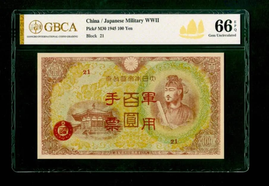 CHINA Japanese Military WWII Gem UNC Graded EPQ 66 Unique and Rare 1945 Issue Very Unique And Rare