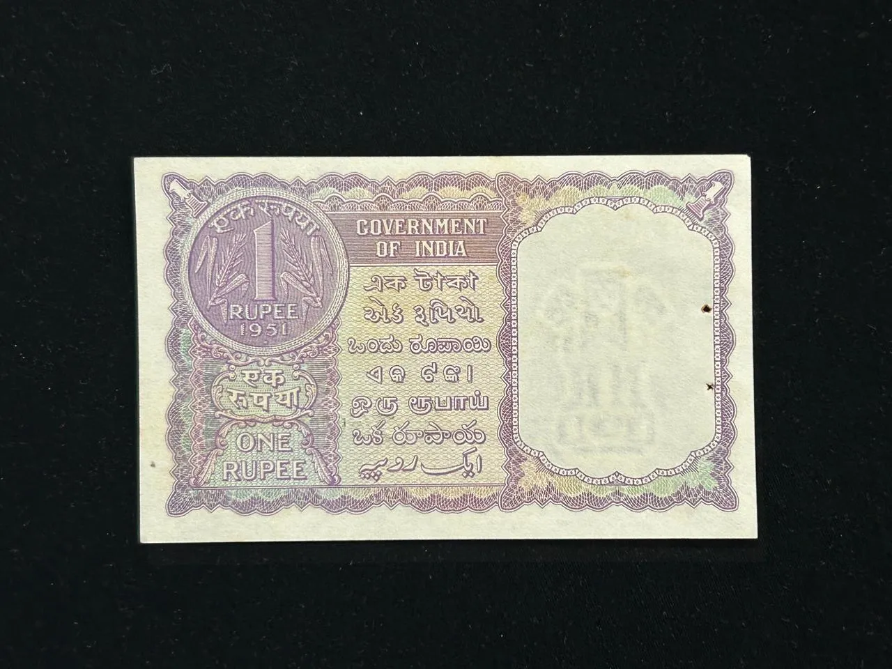 India, 1951 Rupee 1 Banknote, Fancy Mirror Serial Number 760-067, Sign. H.M. Patel, Inset A, UNC, (V66 760067)
