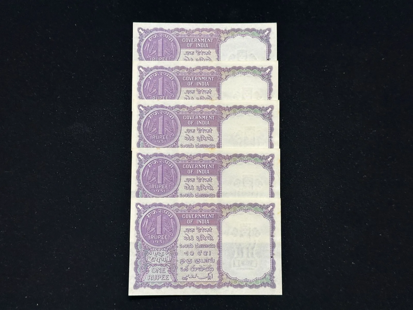 India, 1951 Rupee 1 x 5 Consecutive Serial Number Banknotes, Sign. H. M. Patel, Inset A, UNC, (C62 902081)