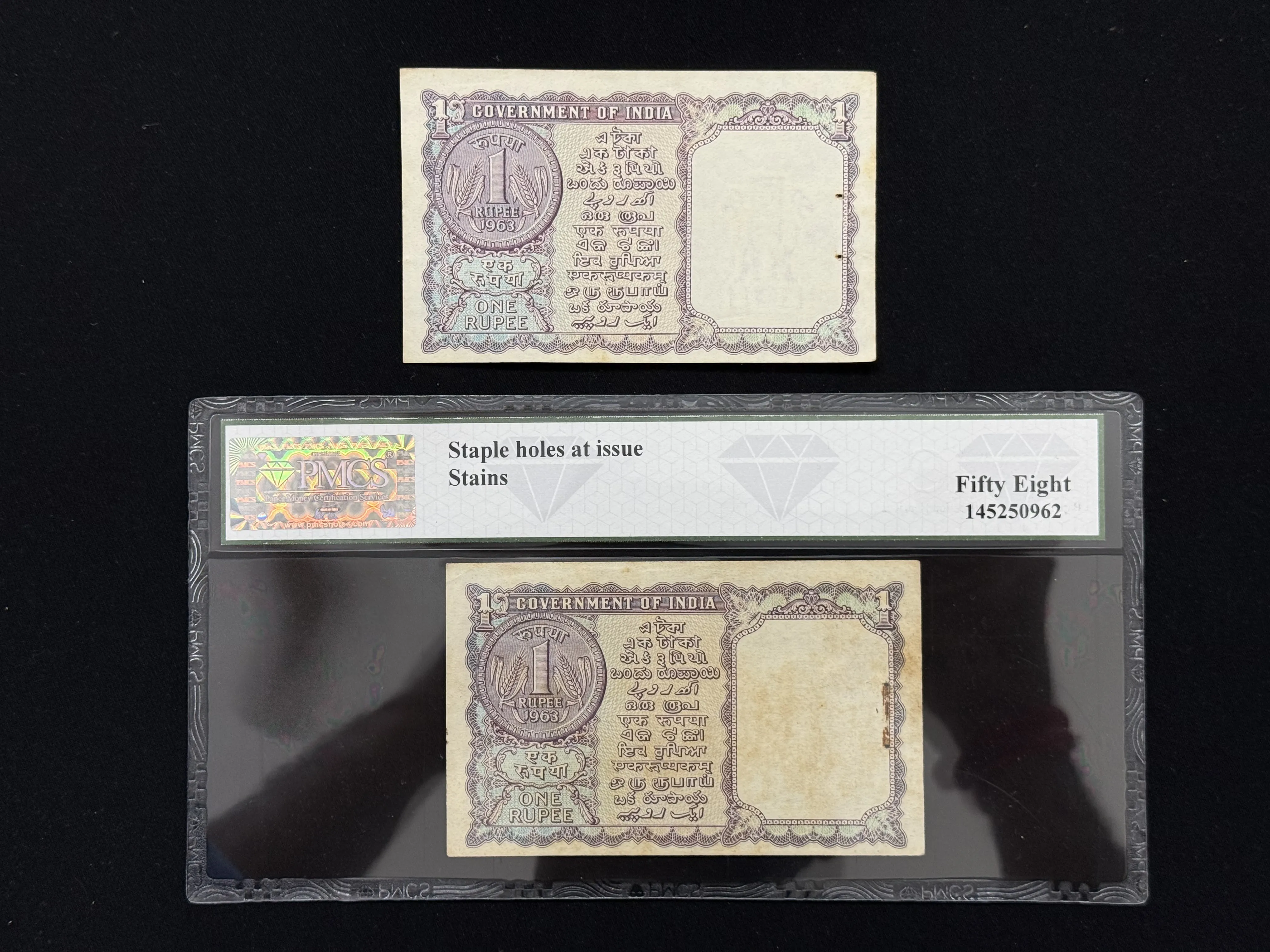 India, 1963 Rupee 1 x 2 Consecutive Serial Number Banknotes, Fancy Serial Number 799999 & 800000, Sign. L. K. Jha, Inset A, PMCS Graded 58 AUNC, RARE & SCARE, (M96 800000)