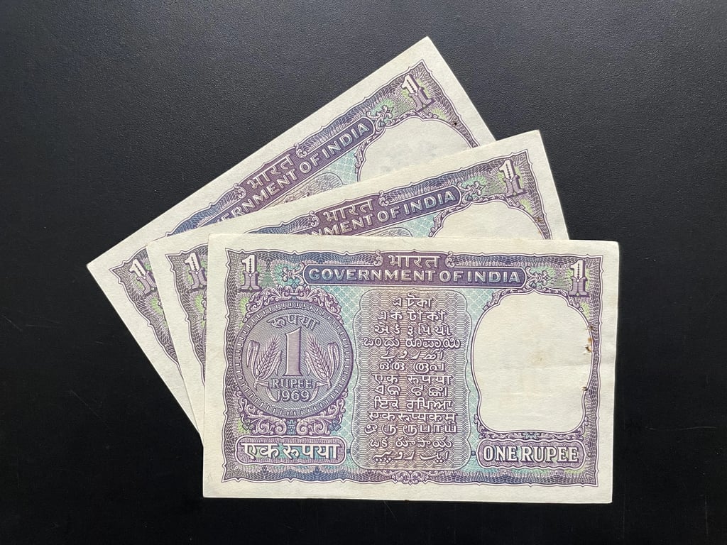 India, 1969 Rupee 1 Banknote x 3 Consecutive Serial Notes, Sign. I. G. Patel, Inset C, UNC