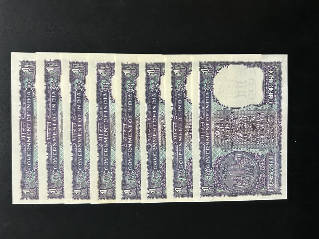 India, 1976 Rupee 1 x 8 Banknotes, Set Of Fancy Serial Number 999910-999980, Sign. M.G. Kaul, Inset H, UNC