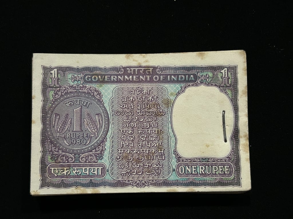 India, 1980 Rupee 1 Complete Fancy Serial Bundle Ending 001 to 100 of 100 Banknotes, Fancy Serial Number Ending 007 (James Bond), Sign. R.N. Malhotra, Inset B