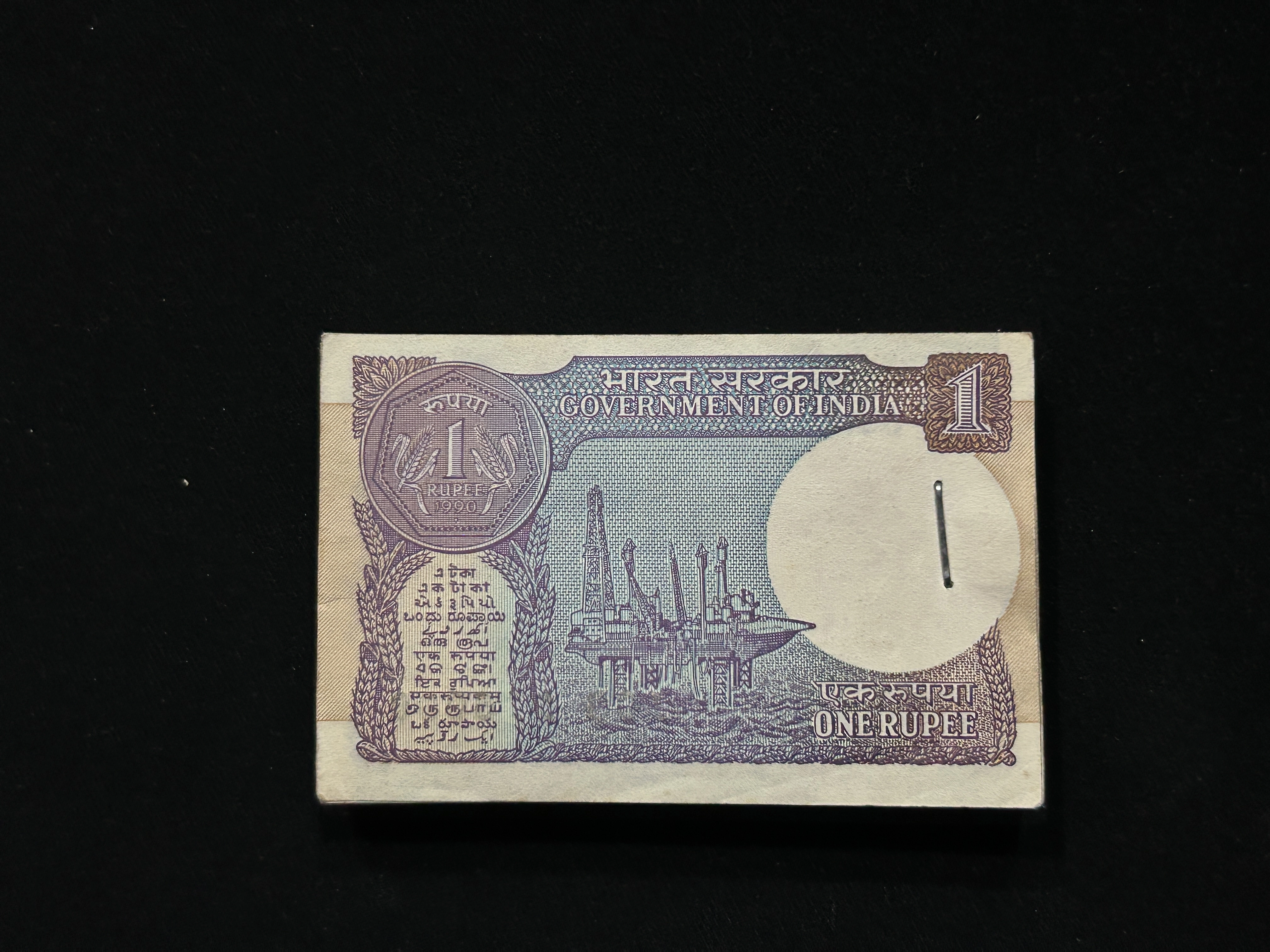 India, 1990 Rupee 1 Complete Serial Bundle of 100 Banknotes, Fancy Serial Number Ending 916 (Hallmark) & 999, Sign. Bimal Jalan, Inset B, UNC