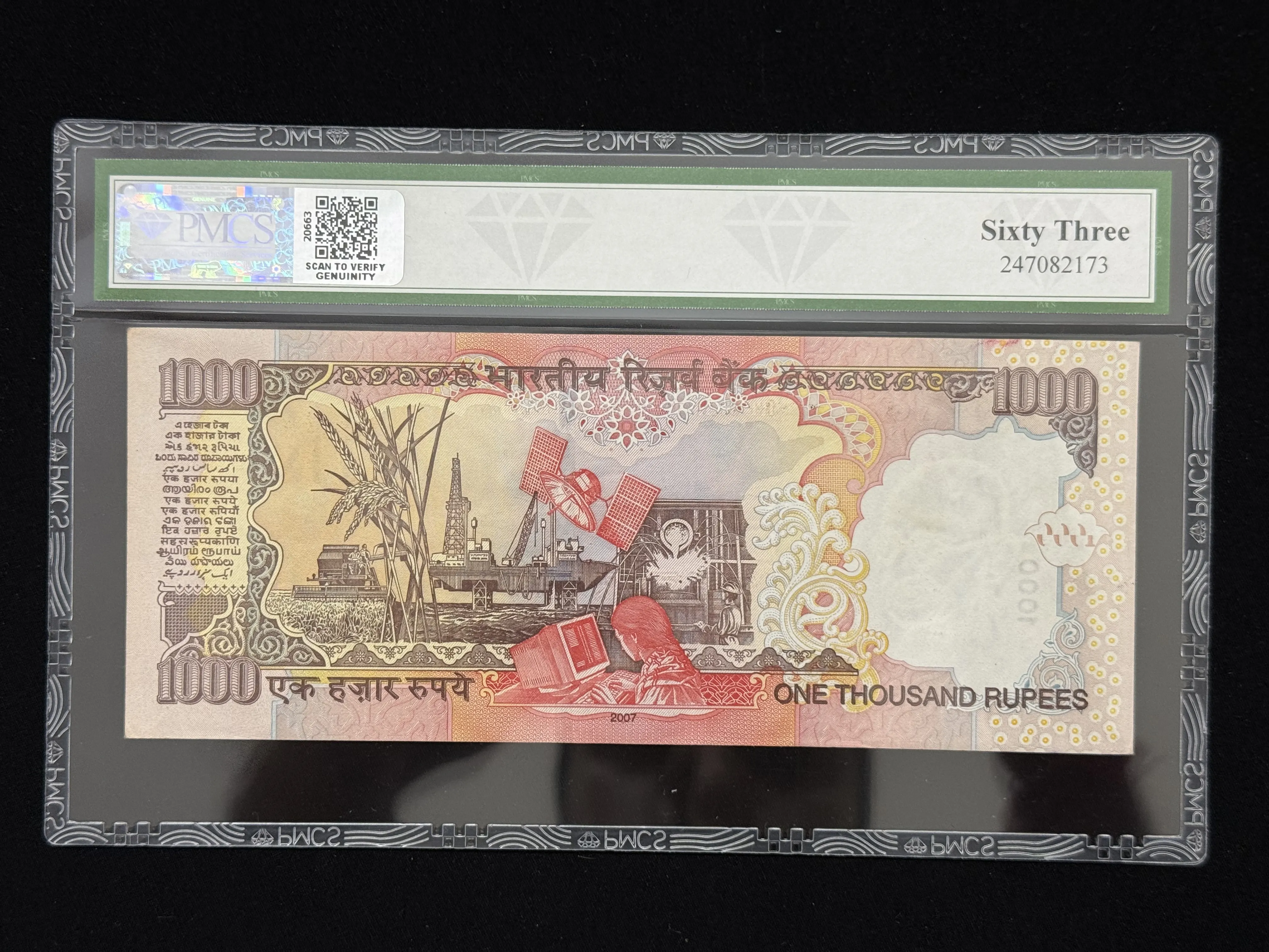 India, 2007 Rupees 1000 Banknote, Fancy Serial Number 900000, Sign. Y.V. Reddy, Inset L, PMCS Graded 63 UNC, (0AQ 900000)