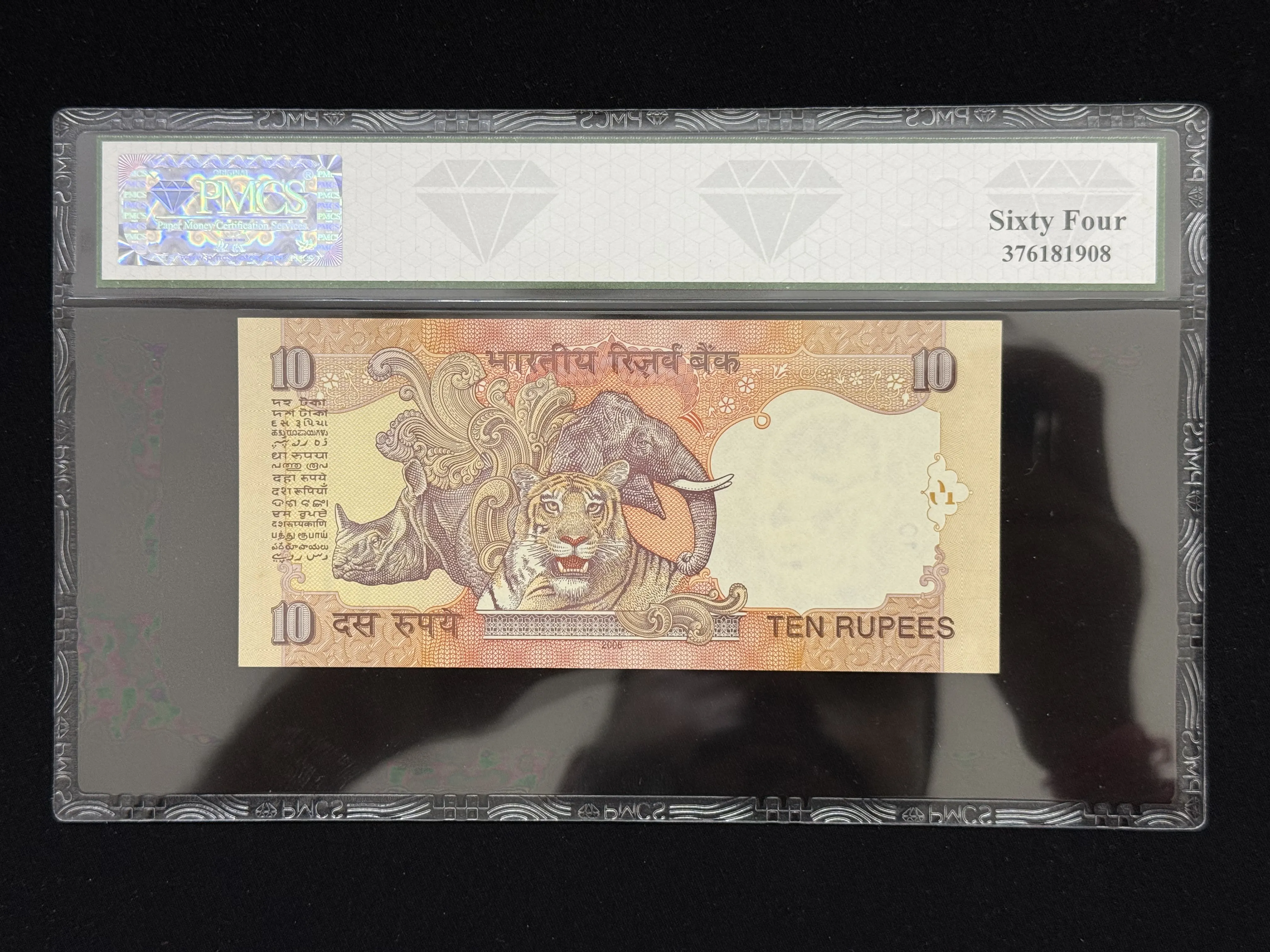 India, 2008 Rupees 10 Banknote, Holy Fancy Serial Number 000-786, Sign. Y. V. Reddy, PMCS Graded 64 UNC, (88N 000786)