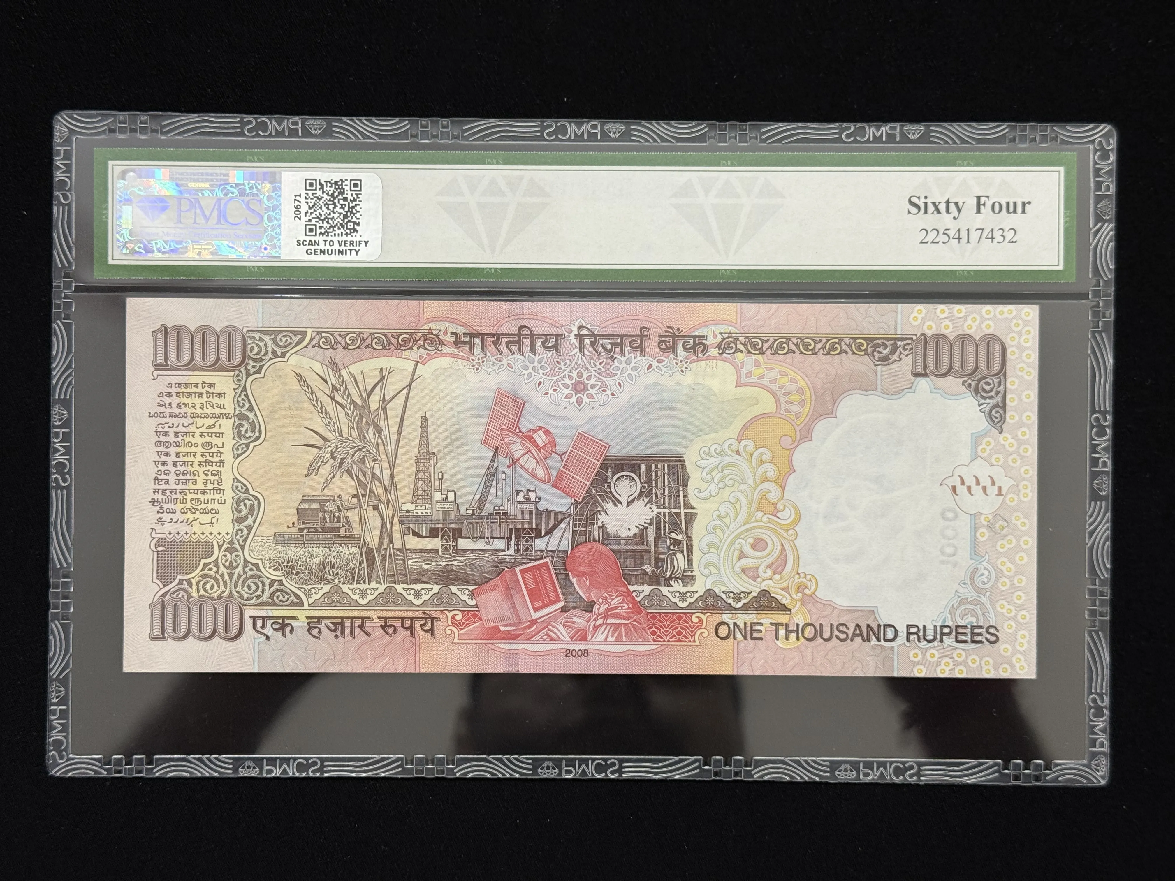 India, 2008 Rupees 1000 Banknote, Fancy Serial Number 500000, Sign. Y.V. Reddy, Inset Plain, PMCS Graded 64 UNC, (3EA 500000)