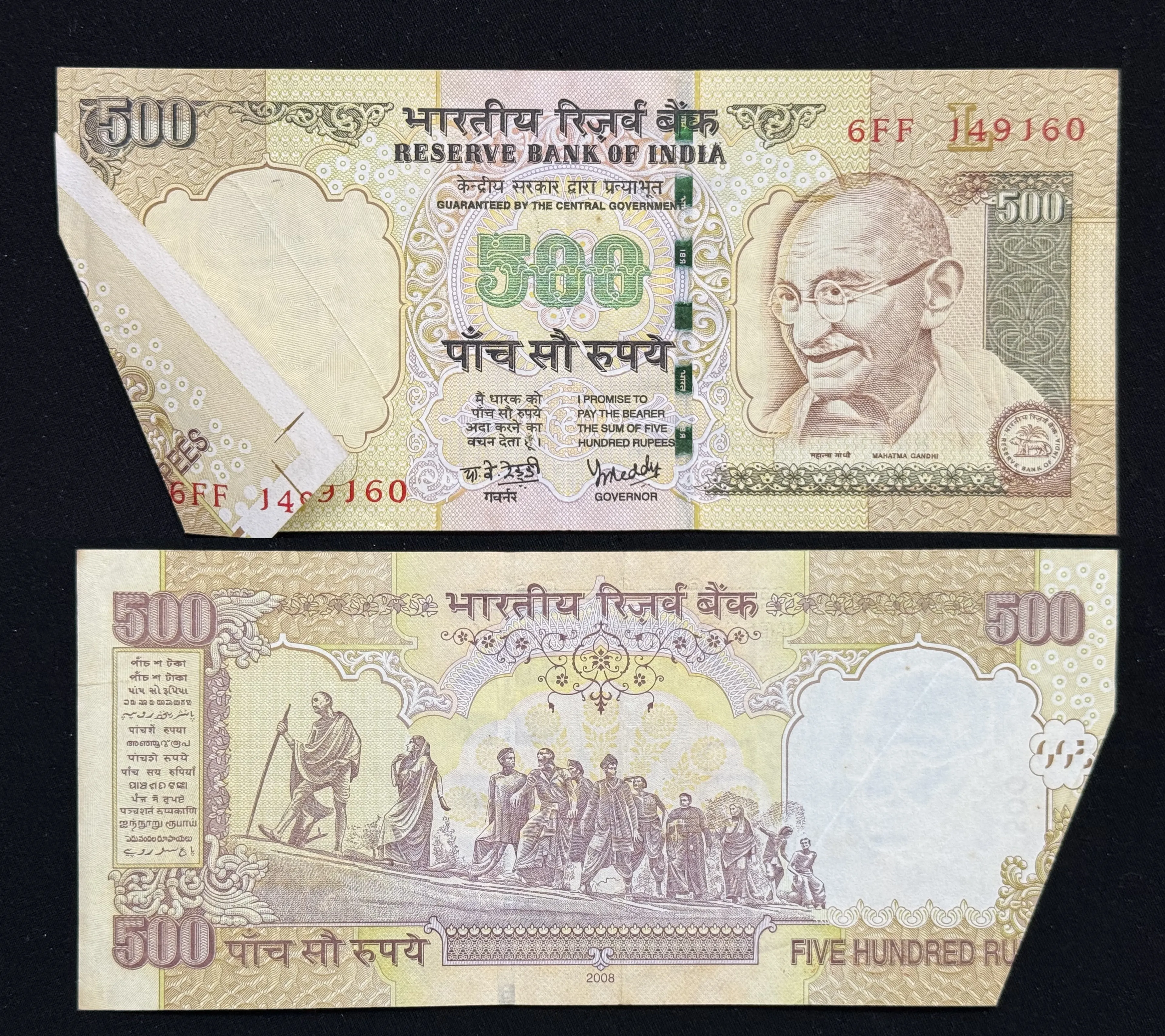 India, 2008 Rupees 500 Banknote, Sheet Fold Cutting & Serial Number Printing Error, Sign. Y.V Reddy, Inset L, RARE, UNC, (6FF 149160)