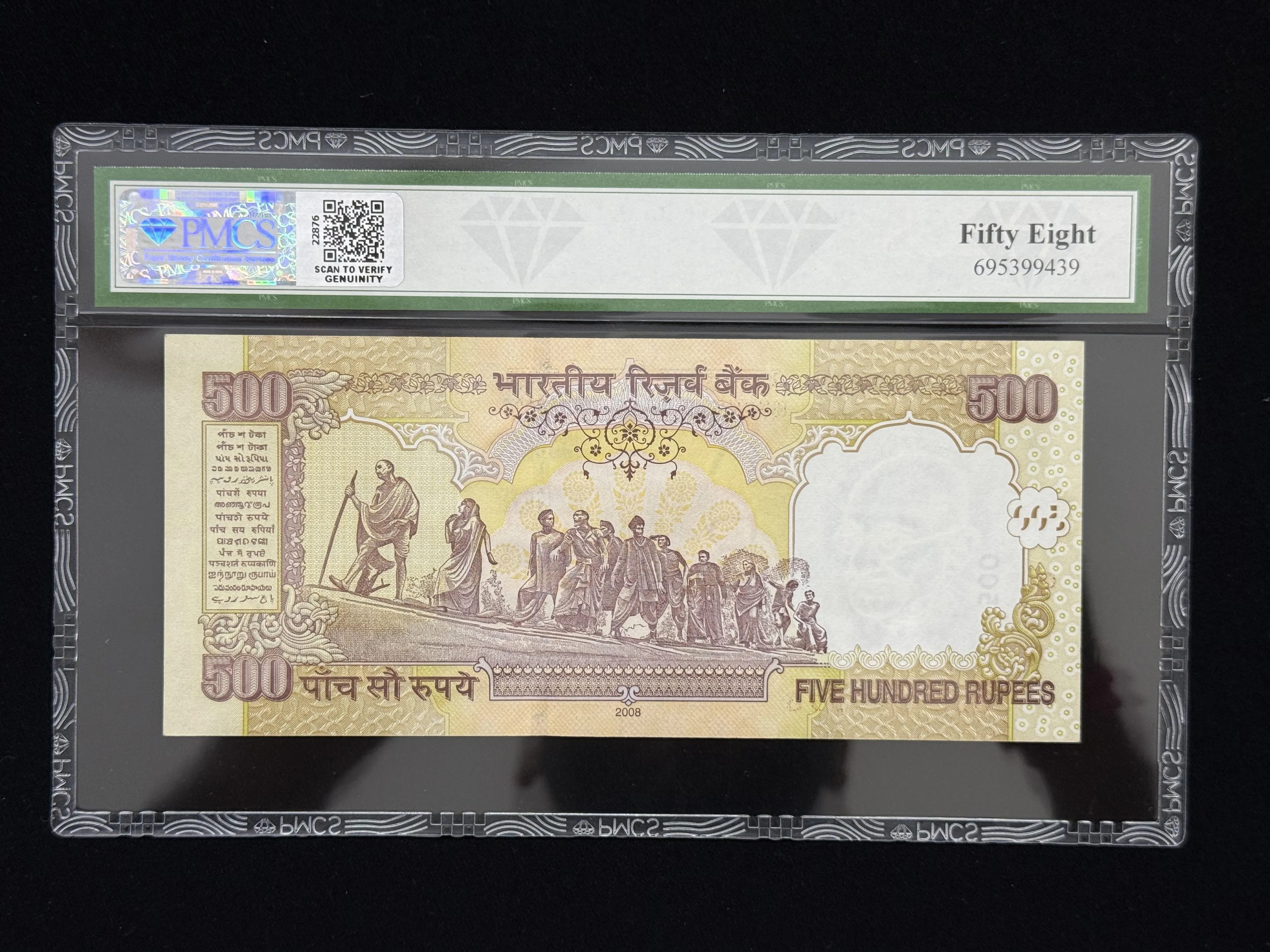 India, 2008 Rupees 500 Banknote, Solid Fancy Serial Number 777777, Sign. Y.V. Reddy, Inset L, PMCS Graded 58 AUNC, (0DS 777777)