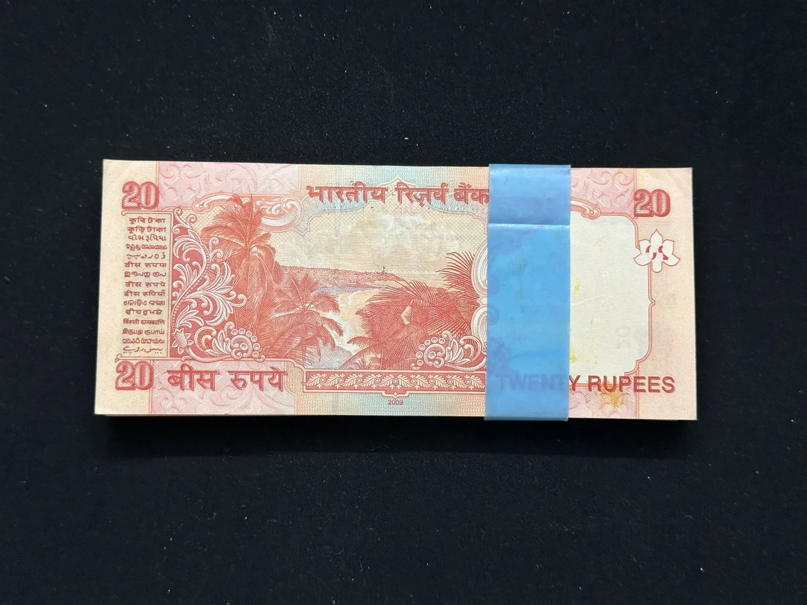 India, 2009 Rupees 20 Complete Serial Bundle of 100 Notes, Holy Fancy Serial Number 111-687 (Reverse 786), Sign. D. Subbarao, Inset E, UNC, (86M 111601)