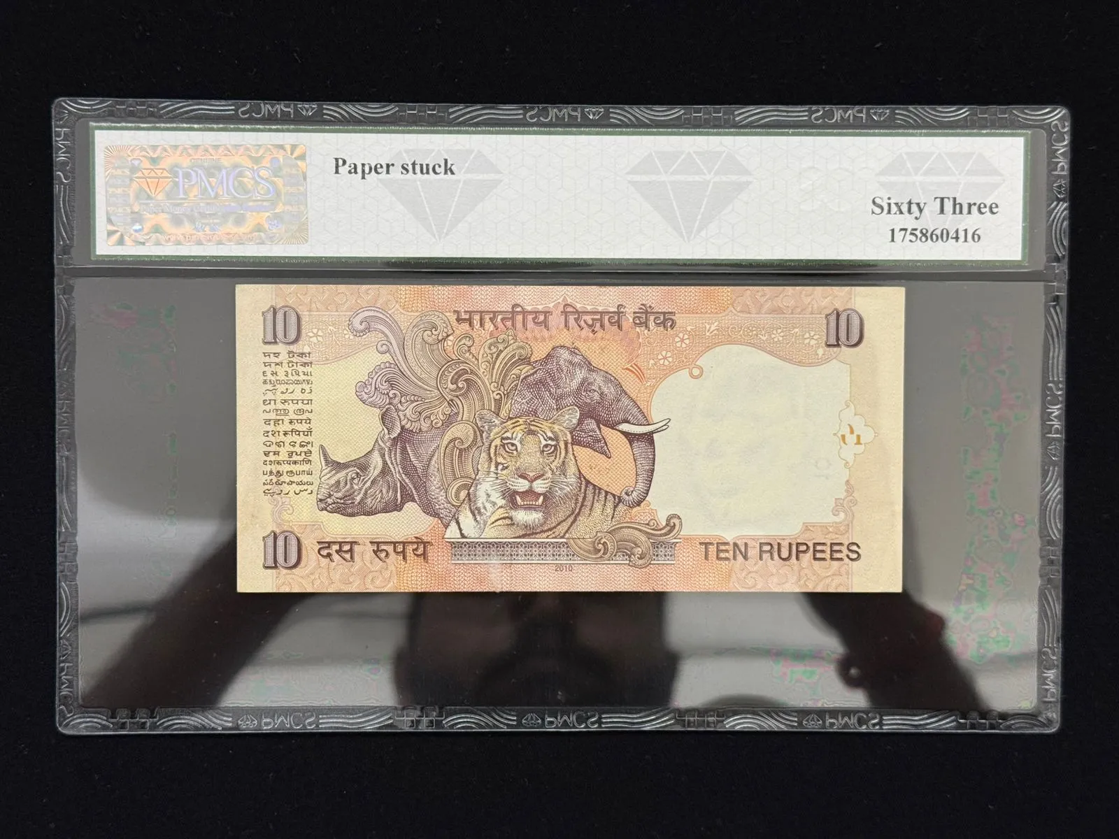 India, 2010 Rupees 10 Banknote, Fancy Serial Number 11 - 100000, Sign. D. Subbarao, Inset A, PMCS Graded 63 UNC, (11D 100000)