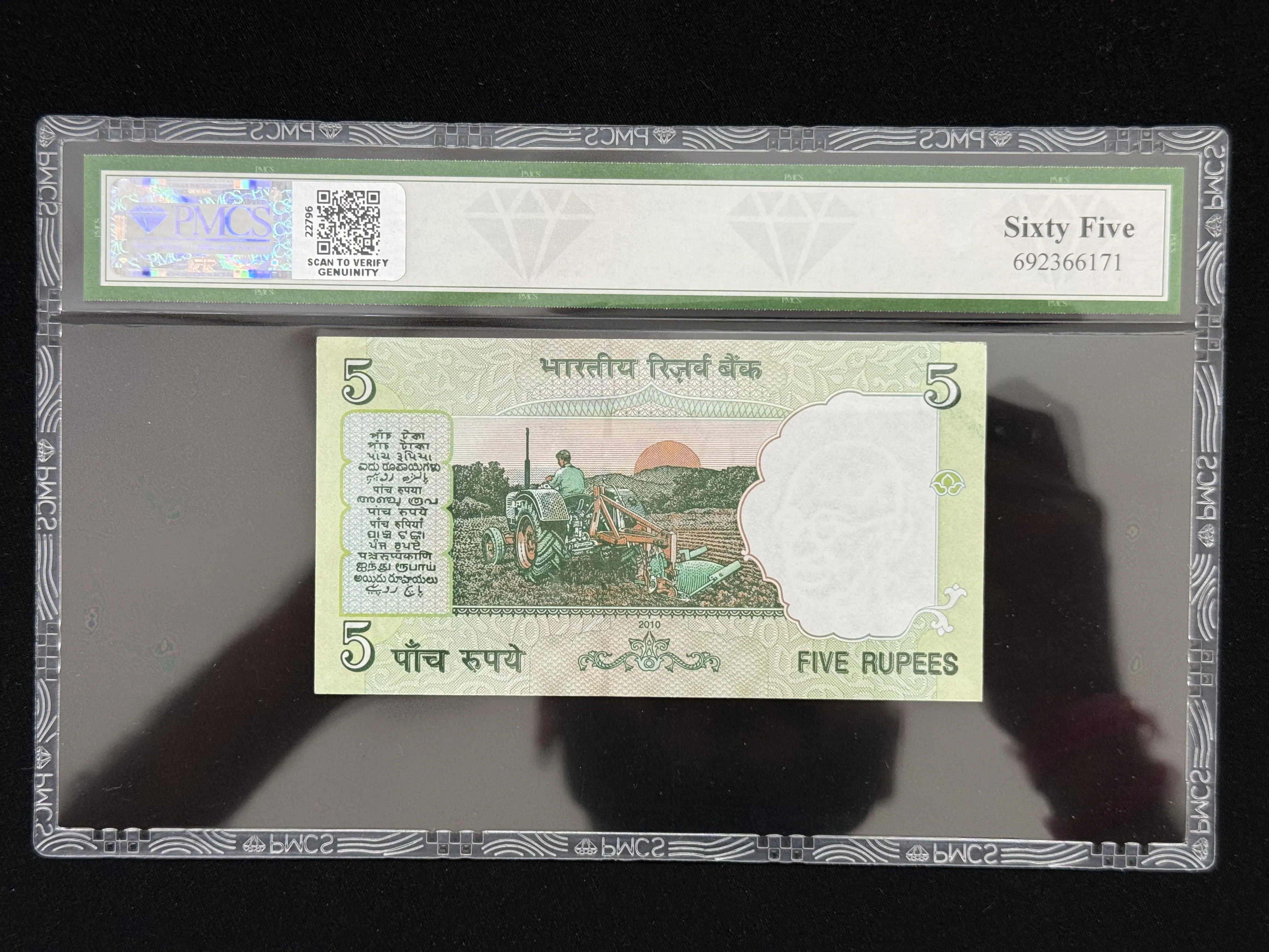 India, 2010 Rupees 5 Banknote, Fancy Serial Number 700000, Sign. D. Subbarao, Inset R, PMCS Graded 65 Gem UNC (Top Grade), (15B 700000)