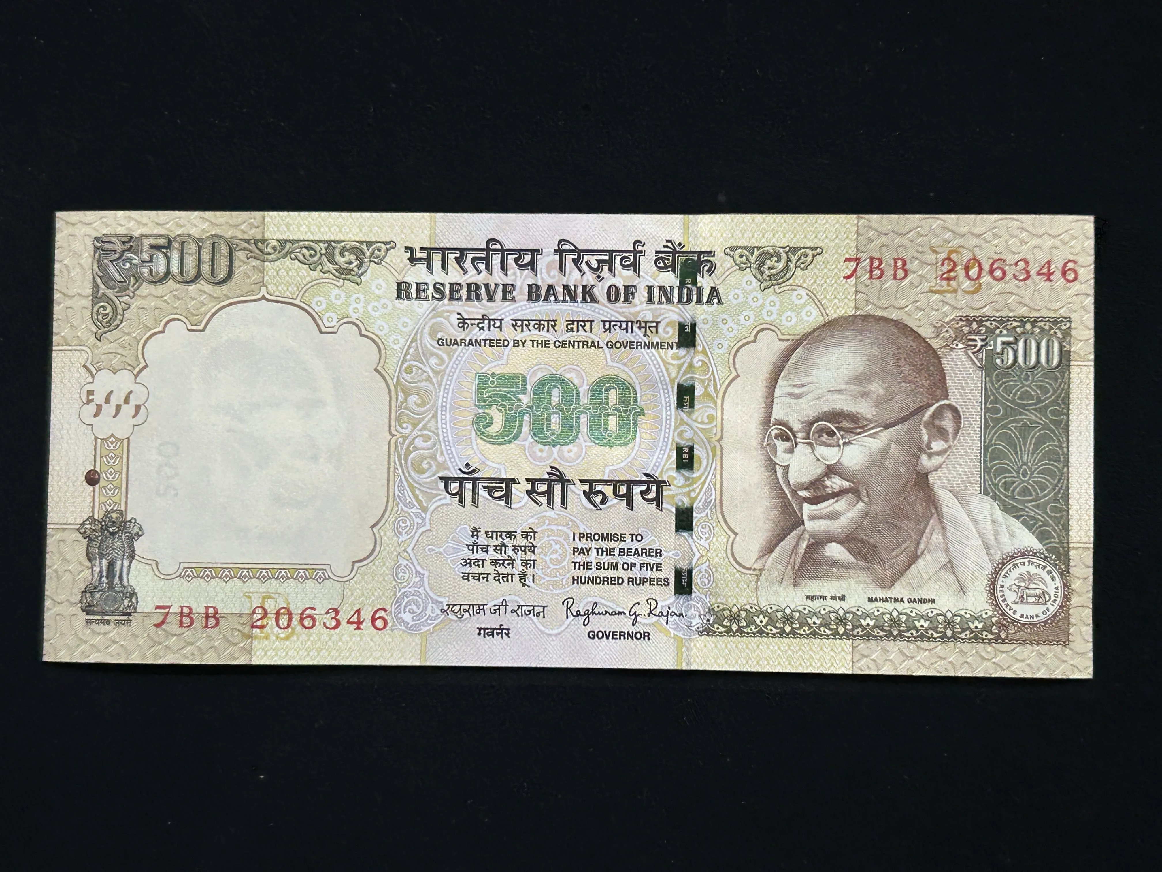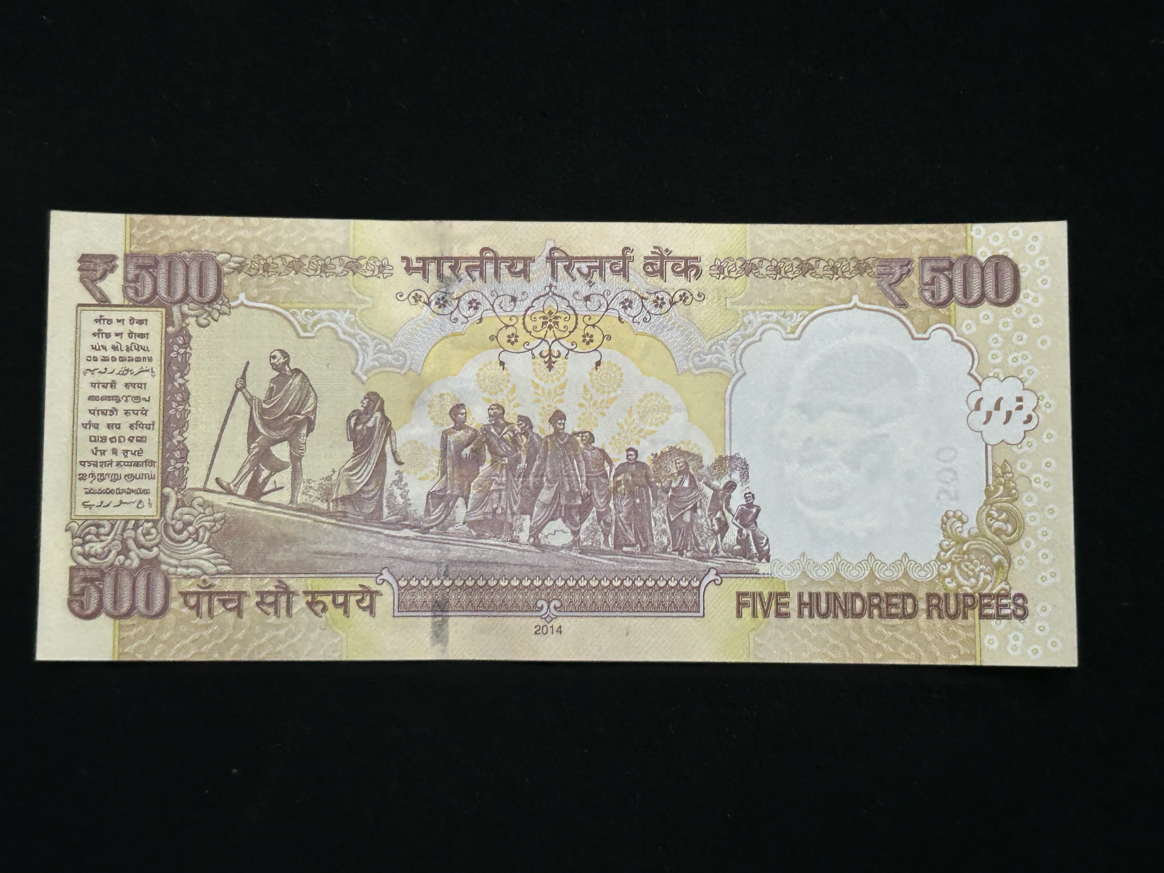 India, 2014 Rupees 500 Banknote, Sign. Raghuram G. Rajan, Inset R, UNC, (7BB 206346)
