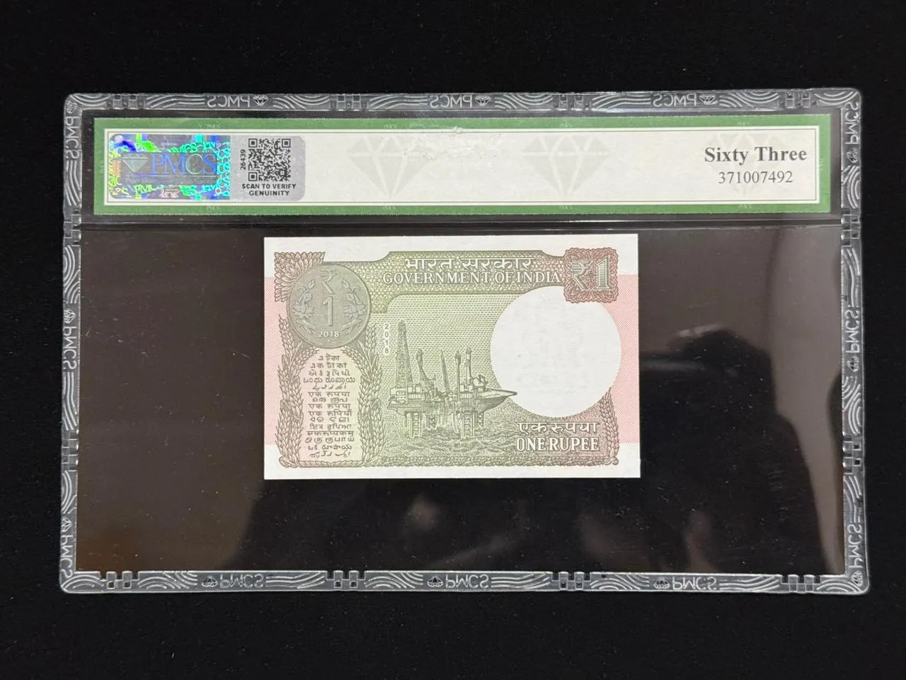 India, 2018 Rupee 1 Star Series Banknote, Holy Fancy Serial Number Ending 214 (RAM), Sign. Subhash Chandra Garg, Inset L, Prefix 00F, PMCS Graded 63 UNC, (00F*827214)