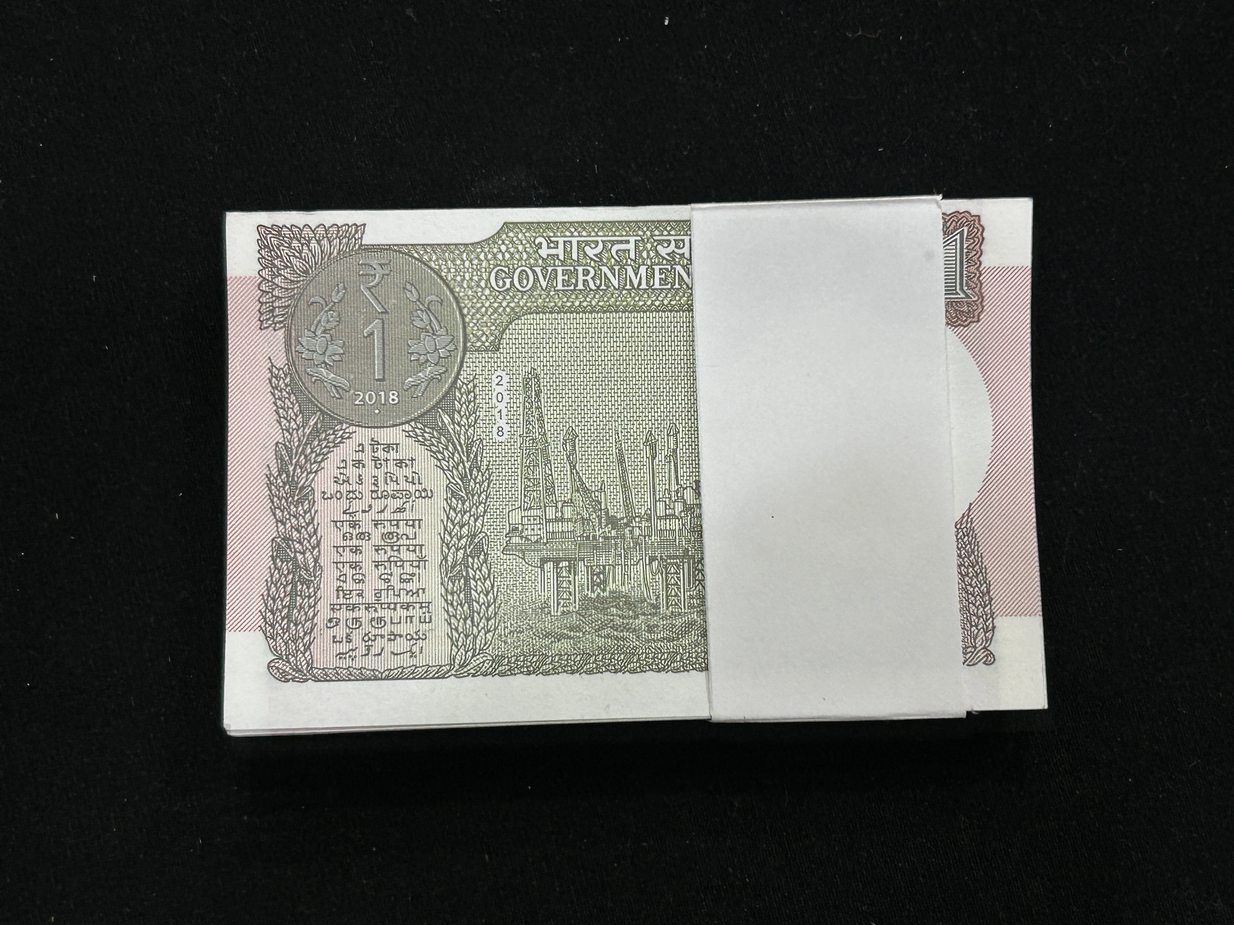 India, 2018 Rupee 1 Complete Serial Bundle of 100 Banknotes, Fancy Serial Number Ending 007 (James Bond), Sign. Subhash Chandra Garg, Inset L, UNC