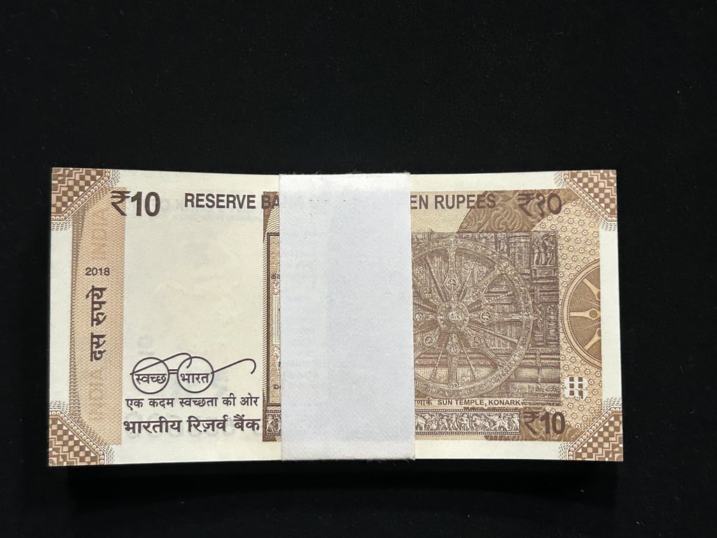 India, 2018 Rupees 10 Complete Serial Bundle of 100 Notes, Solid Fancy Serial Number 555555 & Holy Fancy Serial Number Ending 555-541 (SAI), Small Ladder Serial Number 55-56xx, Sign. Urjit R. Patel, Inset A, UNC