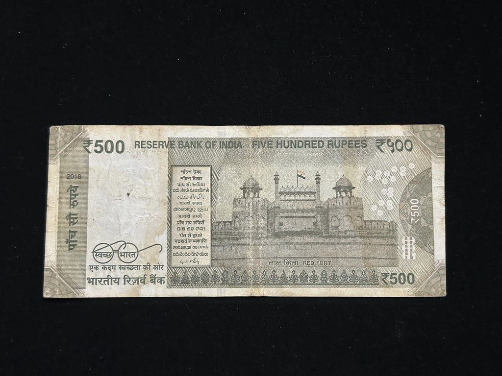 India, 2018 Rupees 500 Banknote, Obverse Double Strike Printing Error, Sign. Urjit R. Patel, Inset L, Used Condition