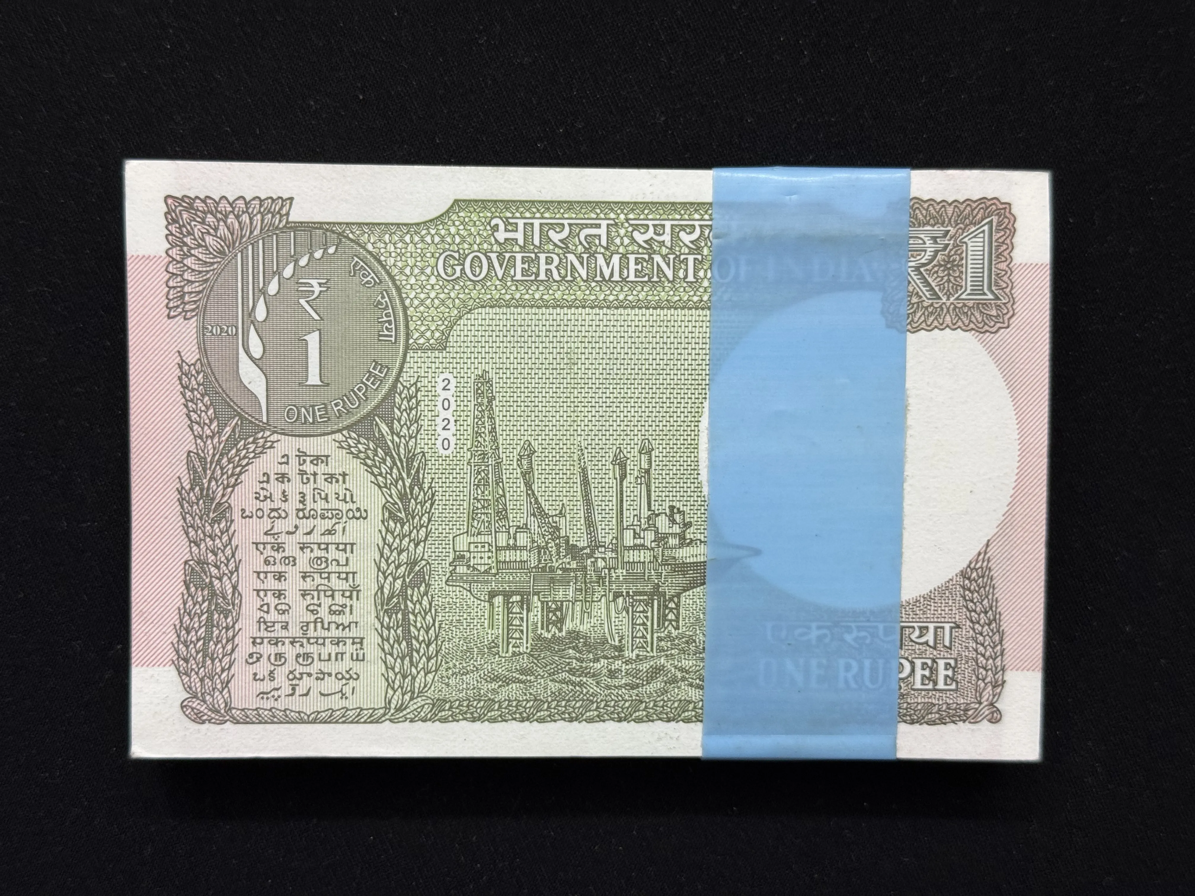 India, 2020 Rupee 1 Complete Serial Bundle of 100 Notes, Fancy Mirror Serial Number 199-991, Fancy Serial Number 199999 & 200000, Sign. Atanu Chakraborty, UNC, Rare, (36A 199901)