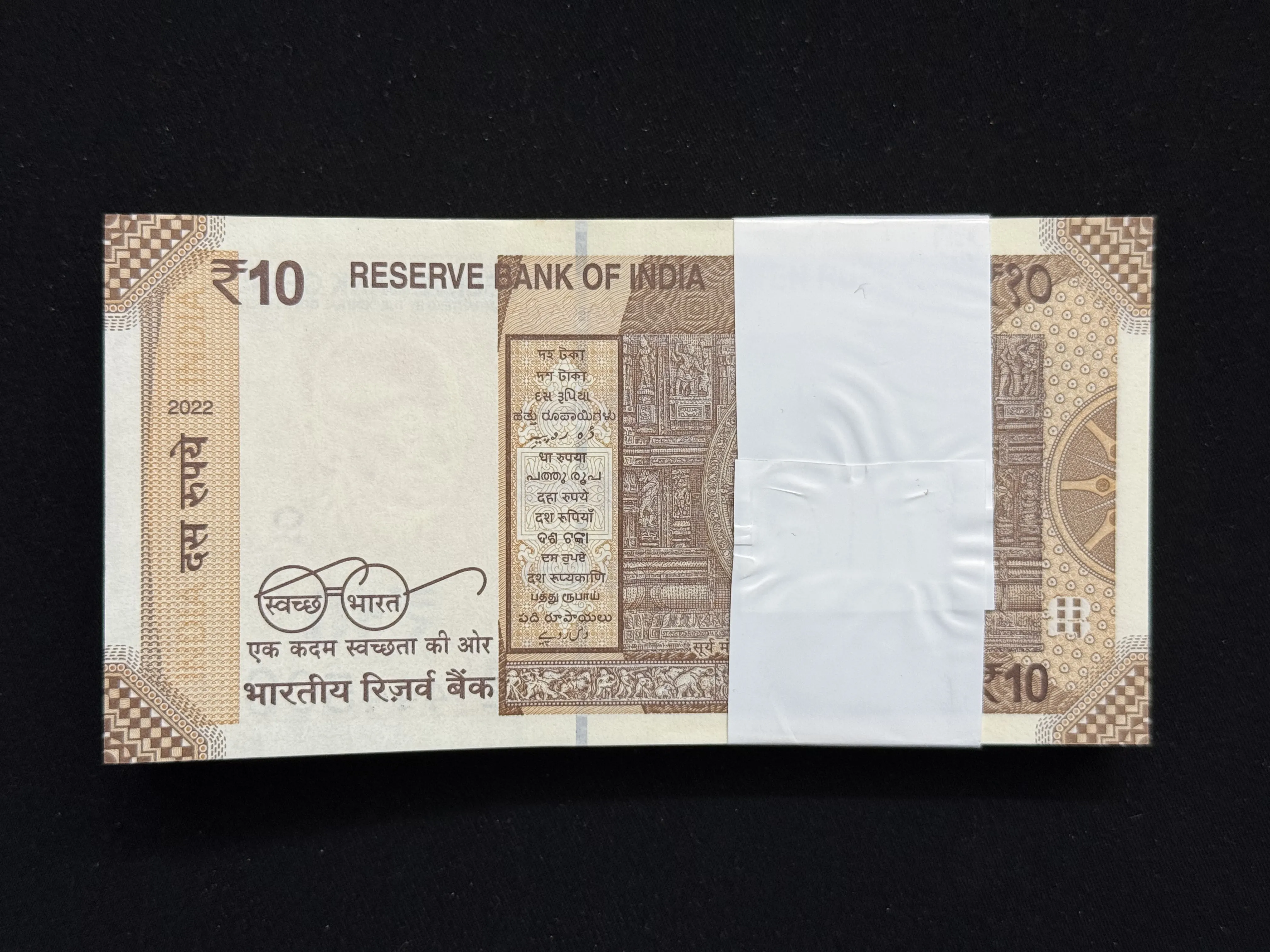 India, 2022 Rupees 10 Complete Serial Bundle of 100 Notes, Solid Fancy Serial Number 444444, Fancy Serial Number Ending 420, Sign. Shaktikanta Das, Inset E, UNC, (74E 444401)