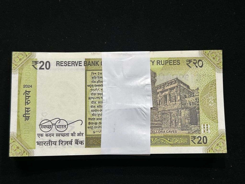 India, 2024 Rupees 20 Complete Serial Bundle of 100 Notes, Fancy Serial Number 999-333, 999x99 & 999-400, Sign. Shaktikanta Das, Inset N, UNC