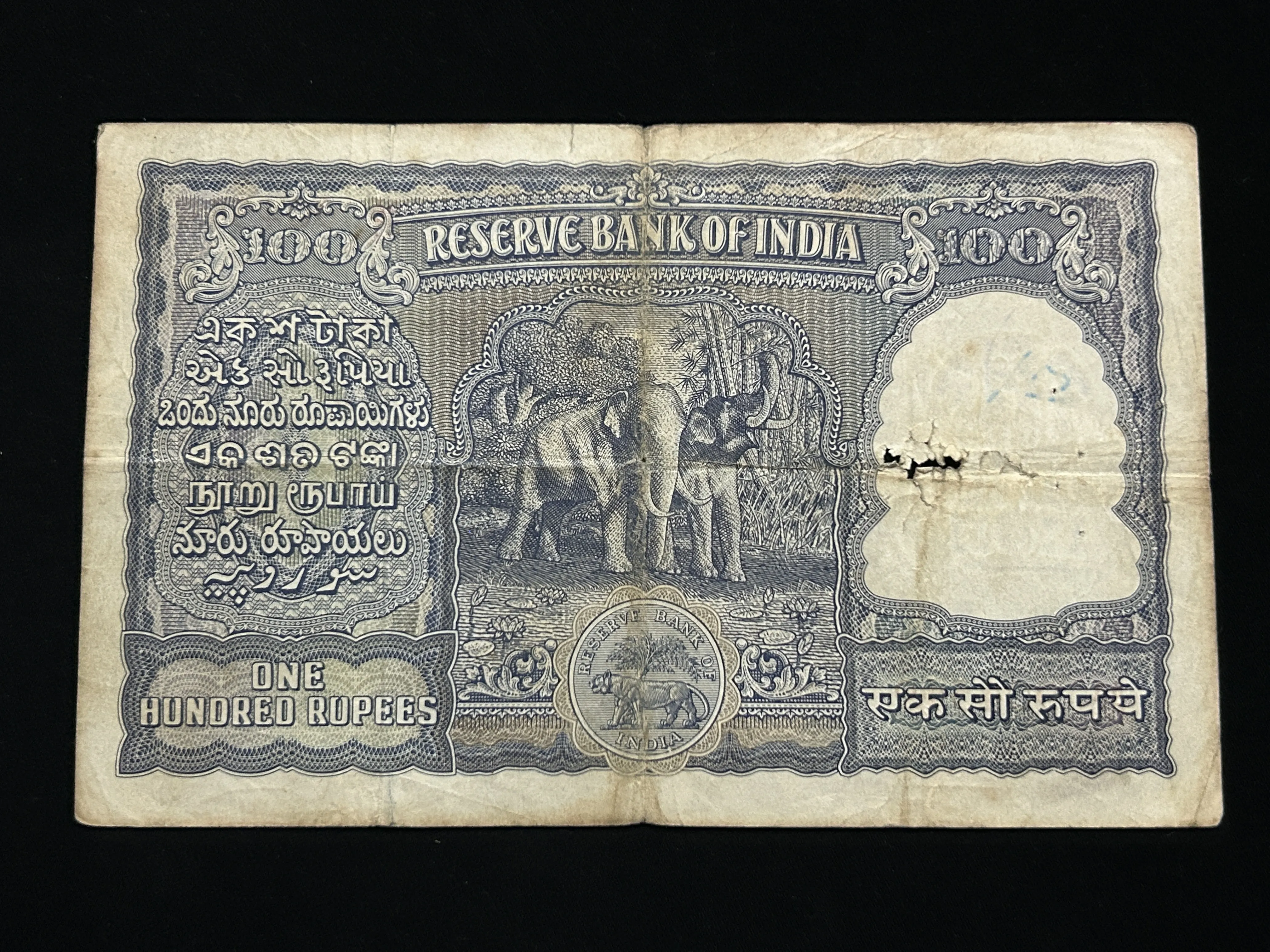 India, Rupees 100 Banknote, Elephant Issue (Fafda Issue), Sign. H.V.R. Iyengar, Prefix AA61, (AA61 904549)