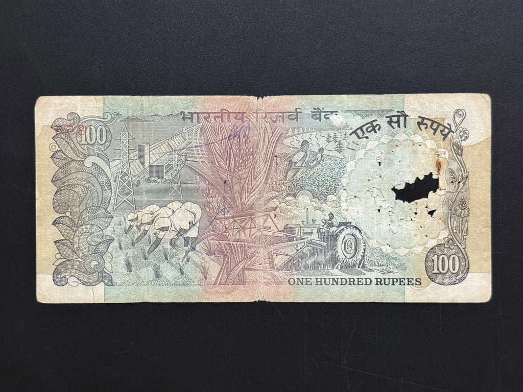 India, Rupees 100 Banknote, Serial Number Printing Error, Agriculture Issue, Sign. C. Rangarajan, Used Condition