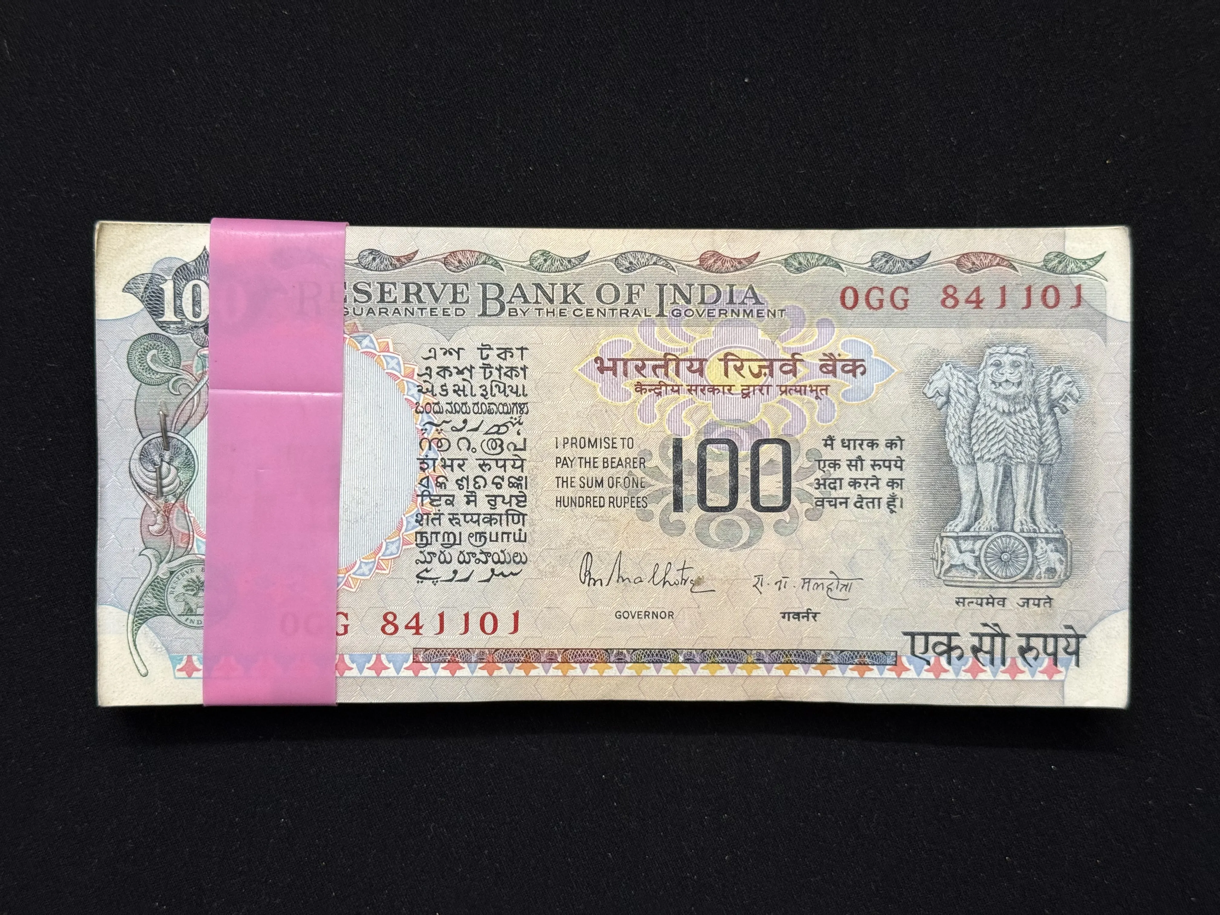 India, Rupees 100 Complete Serial Bundle of 100 Notes, Fancy Mirror Serial Number 841-148, Fancy Serial Number Ending 108, 143 (I Love You) & 111, Cobalt Blue Issue, Sign. R.N. Malhotra, RARE, (74M 615501)