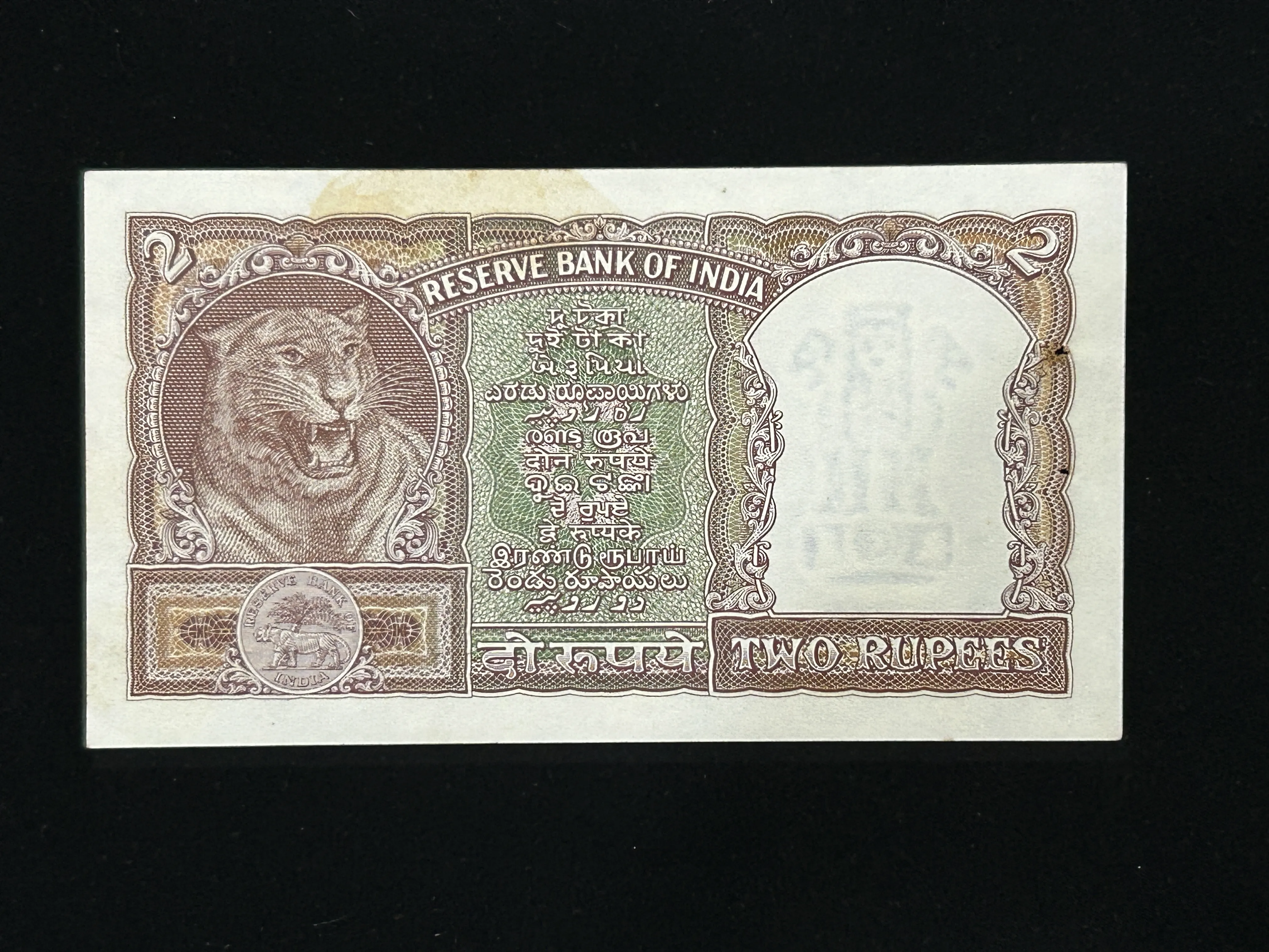 India, Rupees 2 Banknotes, Half Tiger (Brown) Issue, Sign. P.C. Bhattacharya, UNC, (B54 350870)
