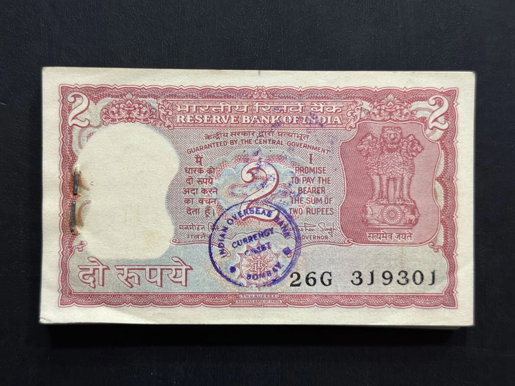 India, Rupees 2 Complete Serial Bundle of 100 Notes, Fancy Doubling Serial Number 319-319, Standing Tiger Issue, Sign. Manmohan Singh, Plain Inset (Satyamev Jayate)