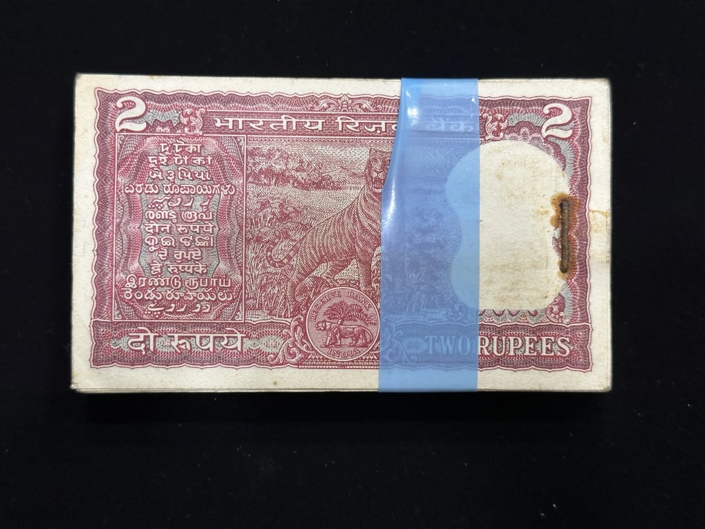 India, Rupees 2 Complete Serial Bundle of 100 Notes, Fancy Serial Number Ending 214 (Ram), Standing Tiger Issue, Sign. I.G. Patel, Inset B