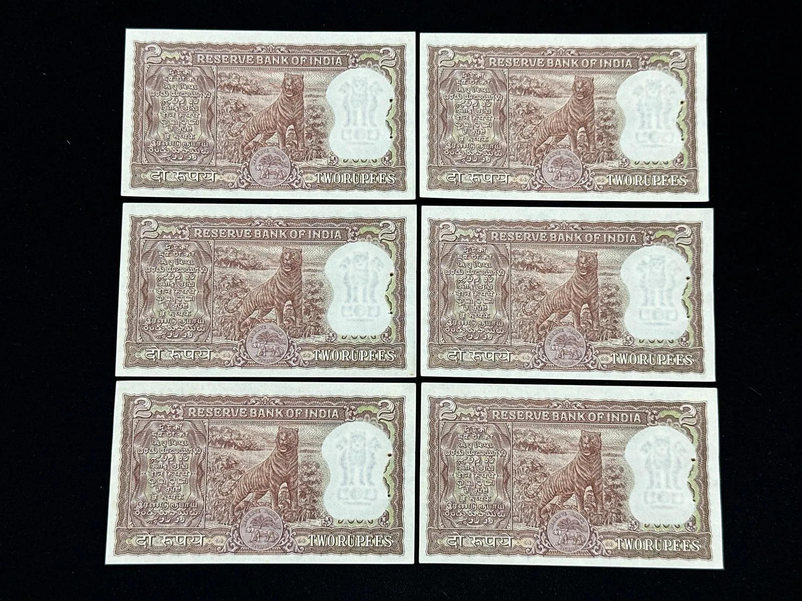 India, Rupees 2 x 6 Consecutive Serial Number Banknotes, Diamond Issue, Sign. P.C. Bhattacharya, UNC, RARE, (E0 386986)