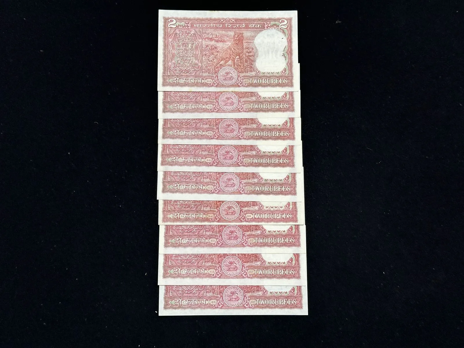 India, Rupees 2 x 9 Banknotes, Set of Fancy Serial Number 76A 777770 - 76A 777779 (76A 777777 Missing), Standing Tiger Issue, Sign. R. N. Malhotra, Inset B, UNC, RARE, (76A 777770)