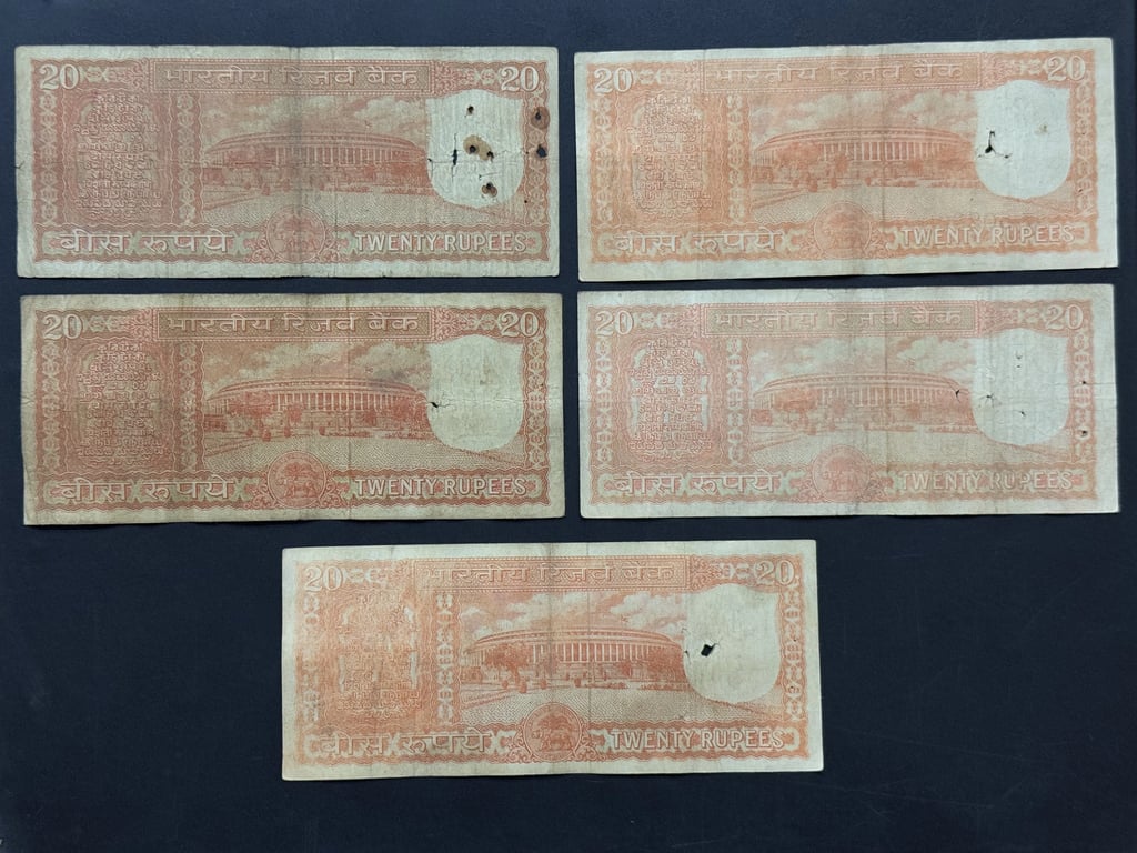 India, Rupees 20 x 5 Banknotes, Parliament Issue, Sign. S. Jagannathan, Used Condition