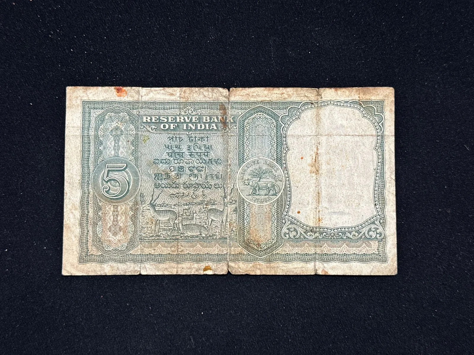 India, Rupees 5 Banknote, Fafda Issue (6 Deer Issue), Sign. H.V.R. Iyengar, Inset Plain, Used Condition, (V30 703176)