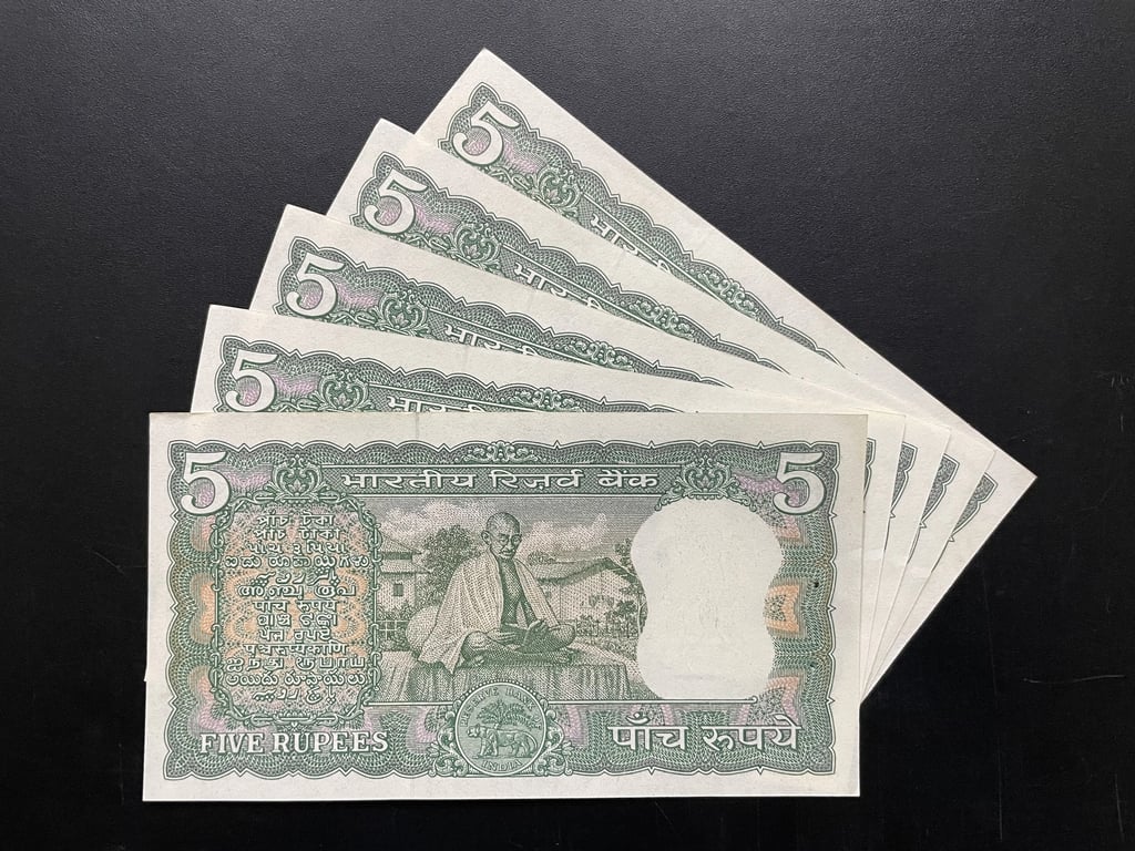 India, Rupees 5 Banknote x 5 Consecutive Serial Notes