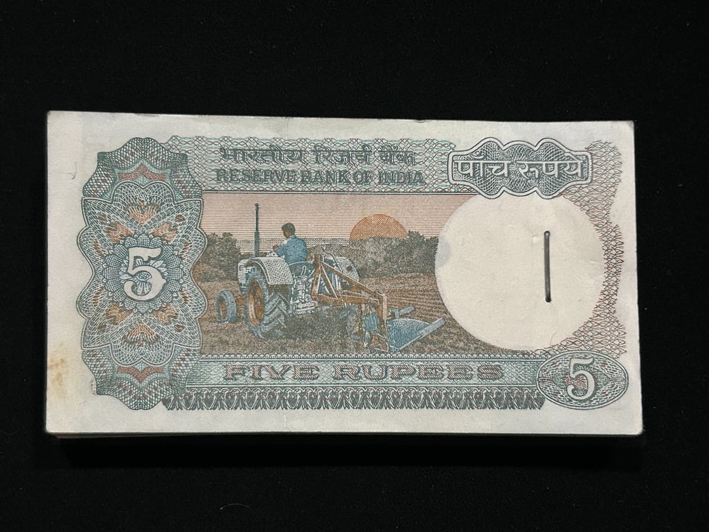 India, Rupees 5 Complete Bundle 100 Banknotes, Holy Fancy Serial Number Ending 541 (SAI) & 555, Tractor Issue, Sign. C. Rangarajan, Inset B, UNC