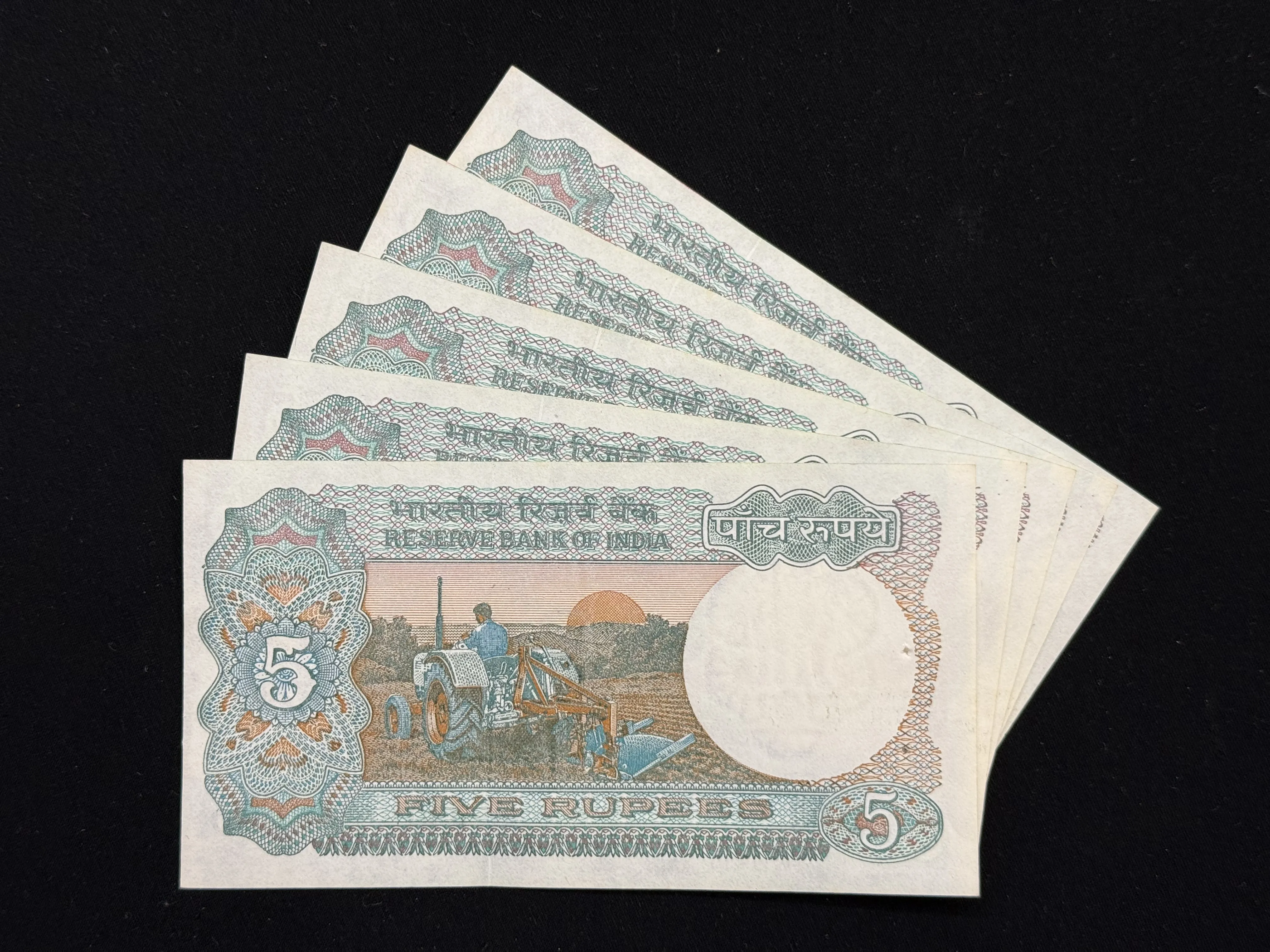 India, Rupees 5 x 5 Consecutive Serial Number Banknotes, Same Prefix (49U), Tractor Issue, Sign. BC. Rangarajan, Inset B, UNC, (49U 908056).