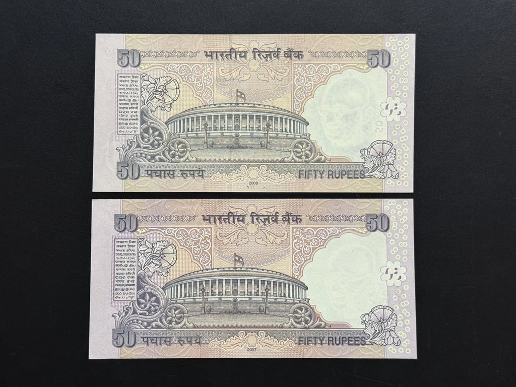 India, Rupees 50 x 2 Banknotes, Fancy Serial Number 999999 & 1000000 (1 Million), Sign. Y. V. Reddy