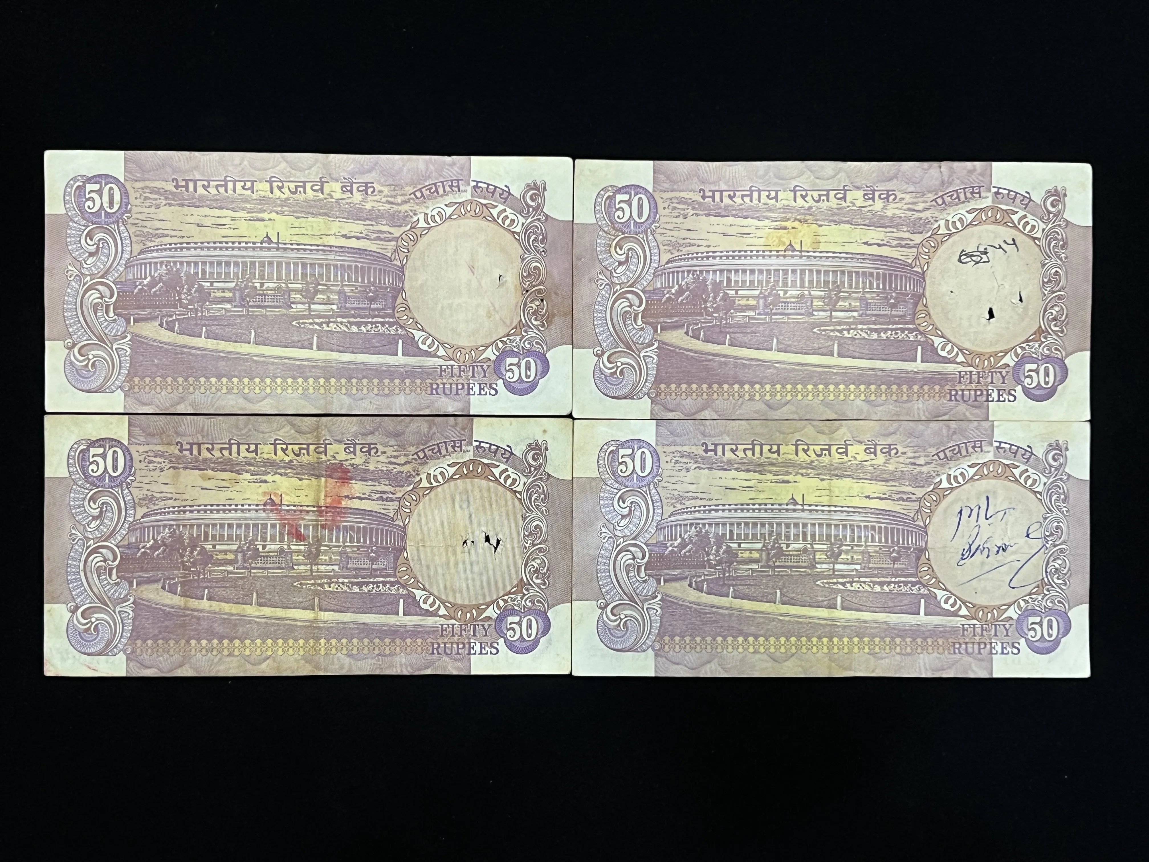 India, Rupees 50 x 4 Banknotes, 2nd Issue, Parliament Issue (Without Flag Issue), Sign. K.R. Puri, (7CB 867909)