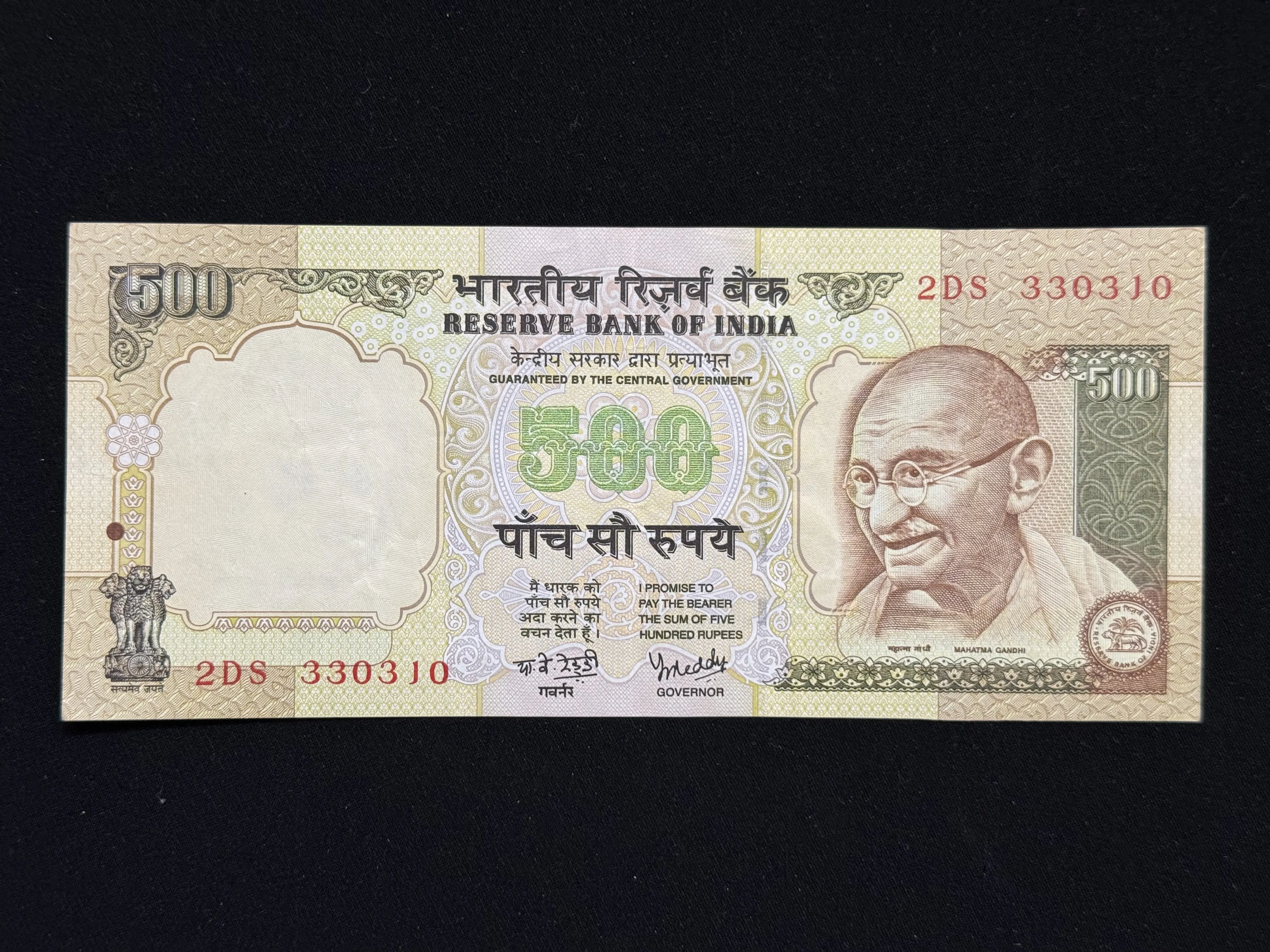 India, Rupees 500 Banknote, Reverse Printing Error, Sign. Y.V Reddy, Inset Plain, RARE, UNC, (2DS 330310)