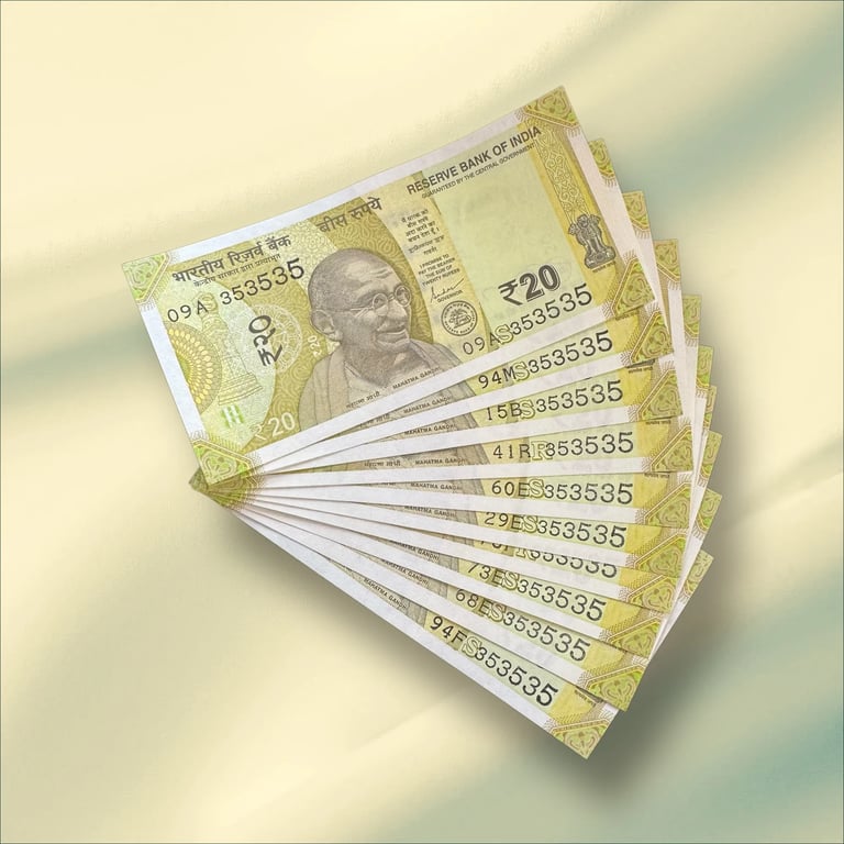 Rs 20/- India Banknote TRIPLING Number *10 Note Set Gem Unc Very Unique and Rare