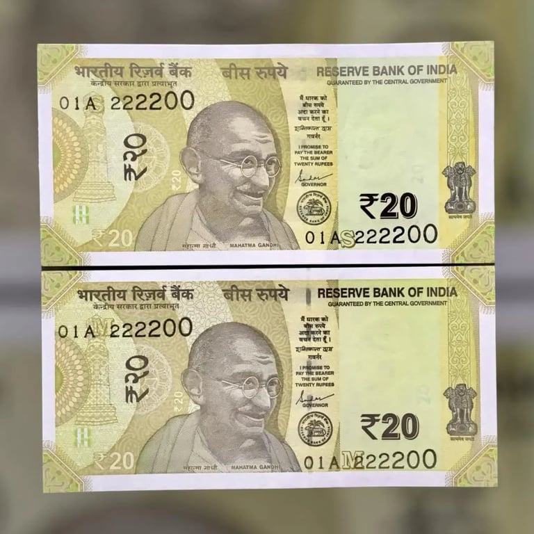 RS 20 INDIA BANK NOTES SEMI FANCY TWIN SETS 01A 222200 UNIQUE AND RARE