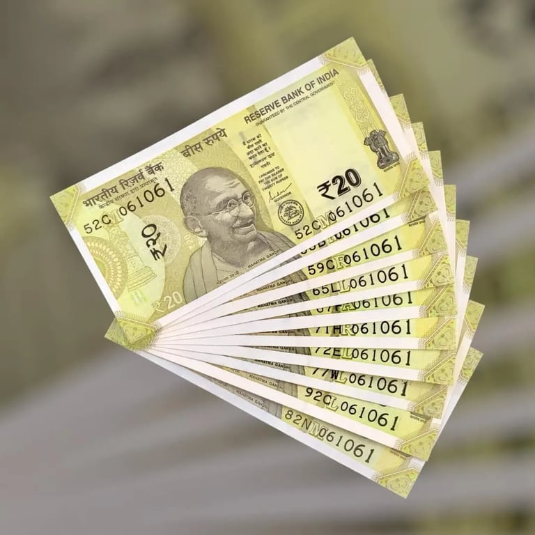 RS 20 INDIA BANK NOTE SEMI FANCY 10 NOTE SAME NUMBER SETS 061061 UNIQUE AND RARE