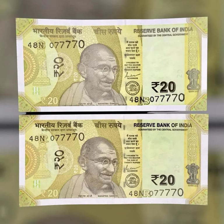 RS 20 INDIA BANKNOTES SEMI FANCY TWIN SETS 48N 077770 UNIQUE AND RARE